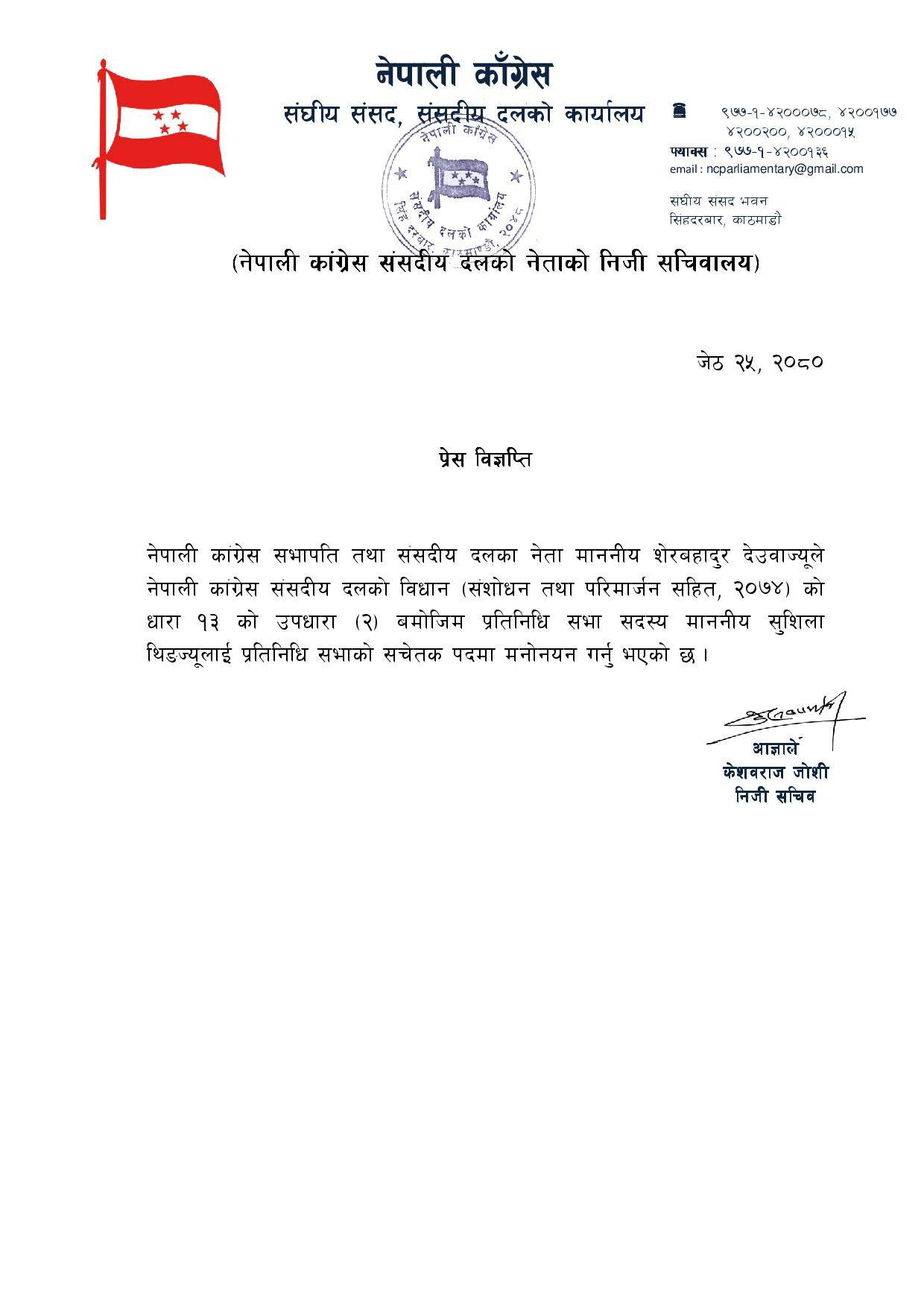देउवाका निजी सचिव केशवराज जोशीका अनुसार संसदीय दलको संसोधित विधानको धारा १३को उपधारा २ बमोदिम मनोनयन गरिएको हो। कांग्रेस सचेतकमा रमेश लेखक छन्। थिङ पार्टी केन्द्रीय सदस्य तथा सिन्धुलीकी समानुपातिक सांसद हुन् ।