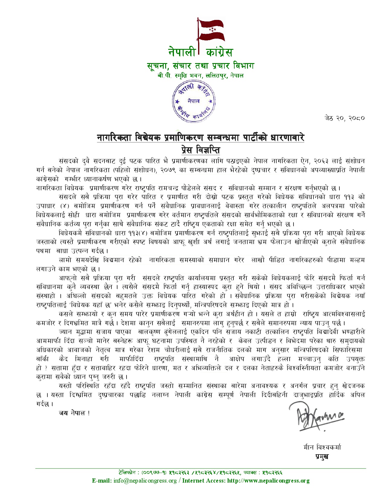 नागरिकता विधेयक प्रमाणीकरणले संसद्को सम्मान र संविधानको रक्षा भएको विज्ञप्तिमा उल्लेख गरिएको छ। ‘नेपाल नागरिकता ऐन, २०६३ लाई संशोधन गर्न बनेको नेपाल नागरिकता (पहिलो संशोधन), २०७९ का सम्बन्धमा हाल भैरहेको दुष्प्रचार र संविधानको अपव्याख्याप्रति नेपाली कांग्रेसको गम्भीर ध्यानाकर्षण भएको छ,’ विज्ञप्तिमा भनिएको छ, ‘नागरिकता विधेयक प्रमाणीकरण गरेर राष्ट्रपति रामचन्द्र पौडेलले संसद र संविधानको सम्मान र संरक्षण गर्नुभएको छ।’