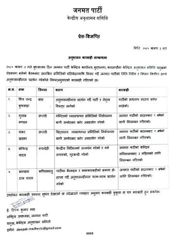 पार्टीको नीति नियमविरुद्ध गतिविधि गरेको भन्दै कुशवाहालाई कारबाही गरेको जनमतले प्रेस विज्ञप्तिमार्फत जानकारी दिएको छ। पूर्वमाओवादी नेता कुशवाहा गत वैशाख १० मा उपनिर्वाचन लड्नकै लागि जनमत प्रवेश गरेका थिए।