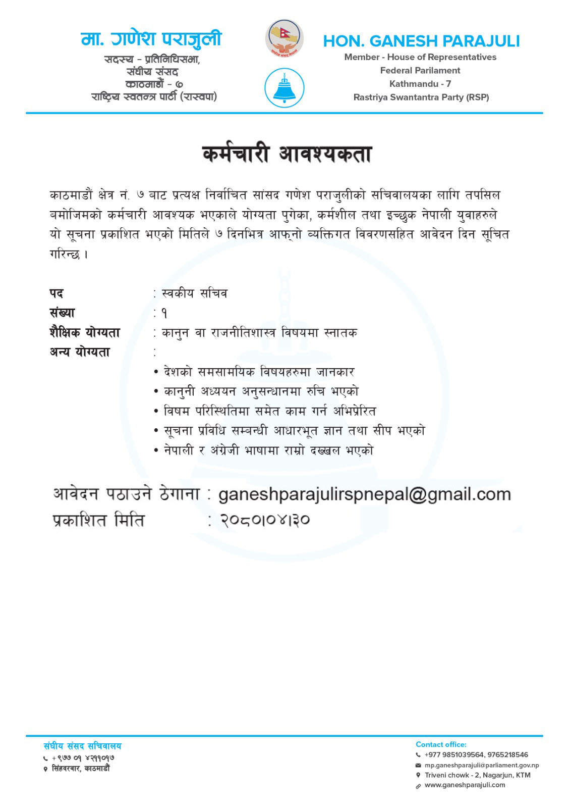 खुला प्रतिस्पर्धाबाट स्वकीय सचिव छान्दै रास्वपा सांसद रास्वपा सांसद गणेश पराजुली