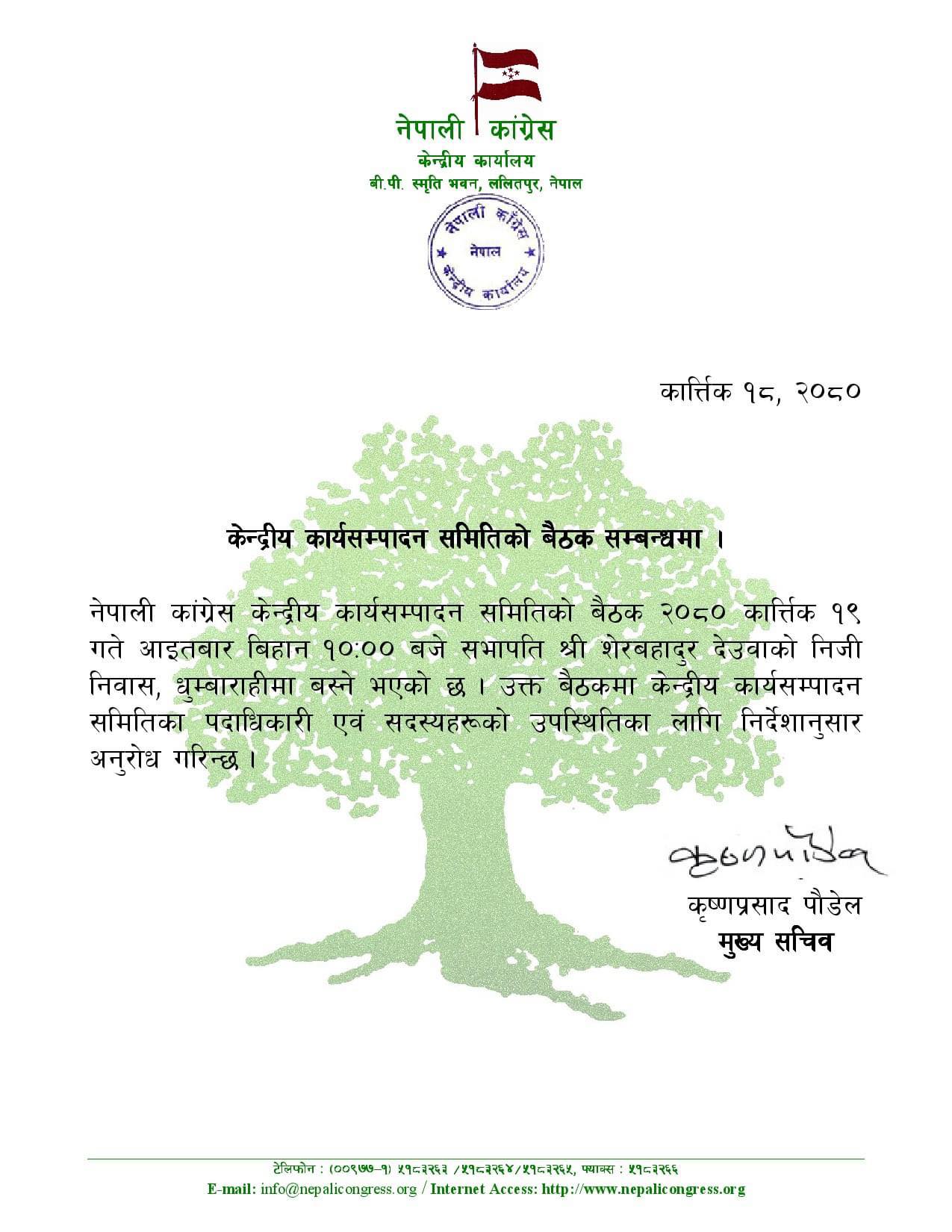 काठमाडौँ- नेपाली कांग्रेसको केन्द्रीय कार्यसम्पादन समितिको बैठक आइतबार बिहान बस्ने भएको छ। पार्टी मुख्यसचिव कृष्णप्रसाद पौडेलका अनुसार बैठक आइतबार बिहान १० बजे सभापति शेरबहादुर देउवाको निवास धुम्बाराहीमा बस्नेछ। बैठकमा जाजरकोट भूकम्पलगायतका विषयमा छलफल हुने बताइएको छ।