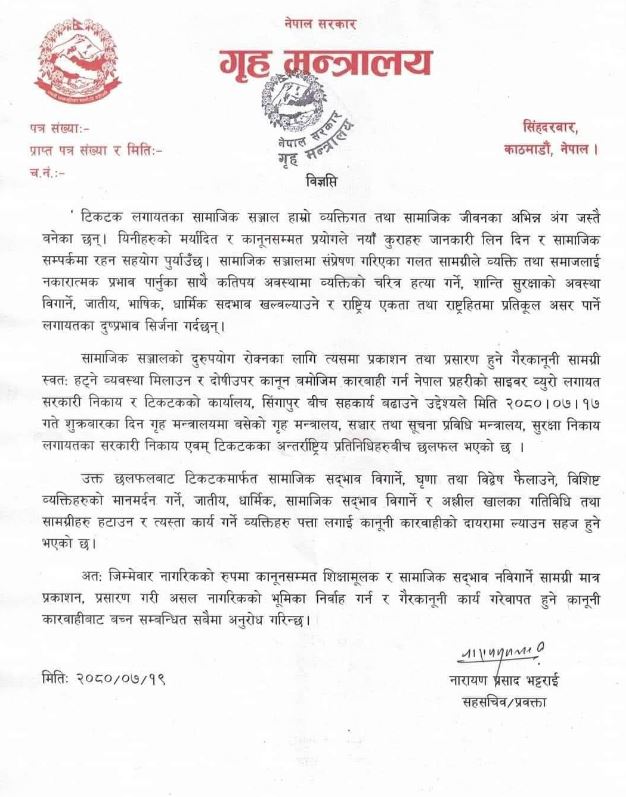 ‘टिकटकमार्फत सामाजिक सद्भाव बिगार्नेलाई कारबाही हुन्छ’