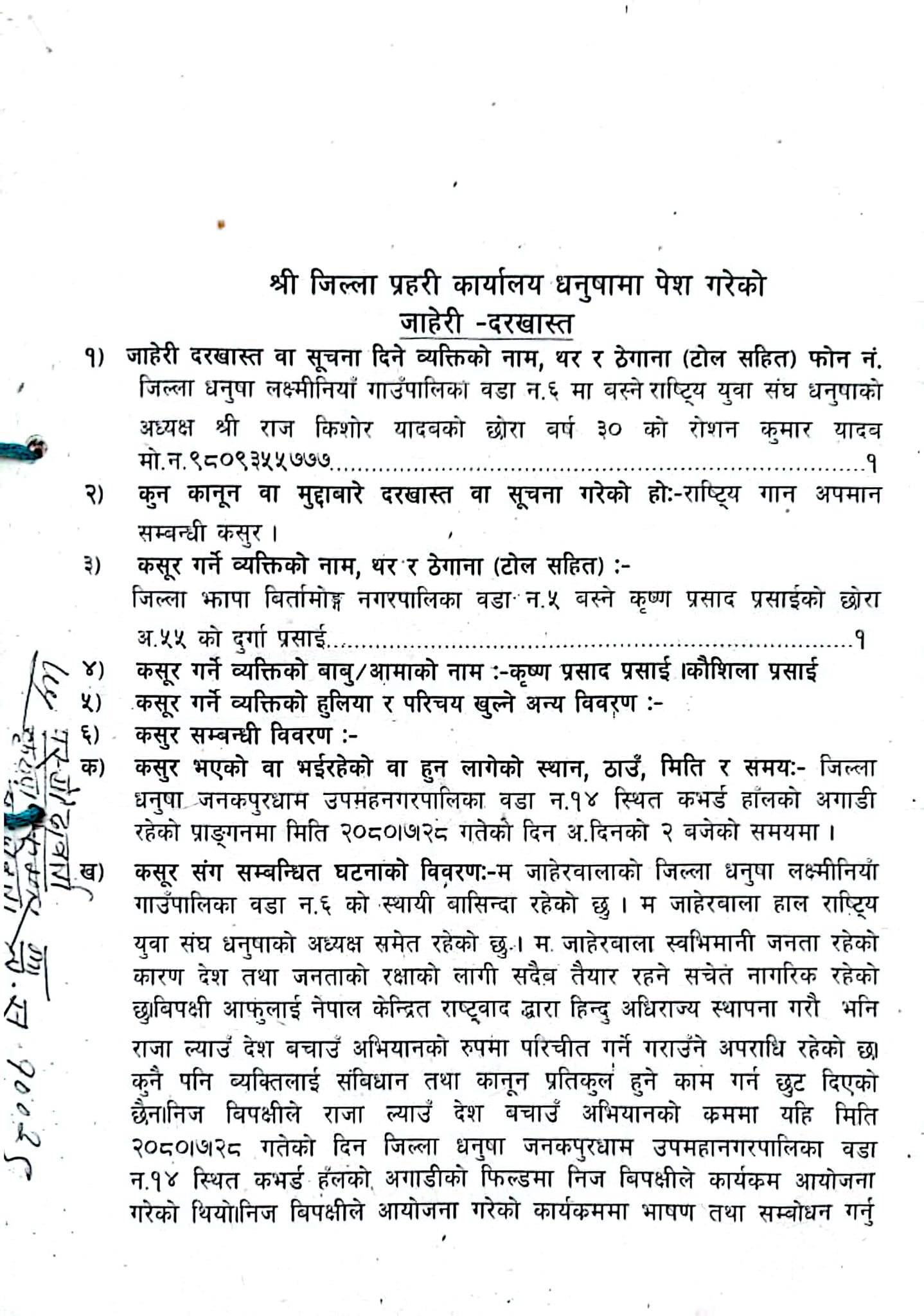 राष्ट्रियगानको अपमान गरेर अपराध गरेको भन्दै प्रसाईविरुद्ध मुद्दा दर्ता गराएको युवा संघ नेपाल धनुषाका अध्यक्ष रोशनकुमार यादवले बताए। मुलुकी अपराध संहिता २०७४ को दफा १५३ सम्बन्धी कसुर गरेको हुनाले निज विपक्षीलाई खोजतलास गरी हदैसम्म कैद तथा जरिवाना गरी पाऊँ भनी जाहेरी दर्ता गरिएको जाहेरीकर्ता यादवले बताए।