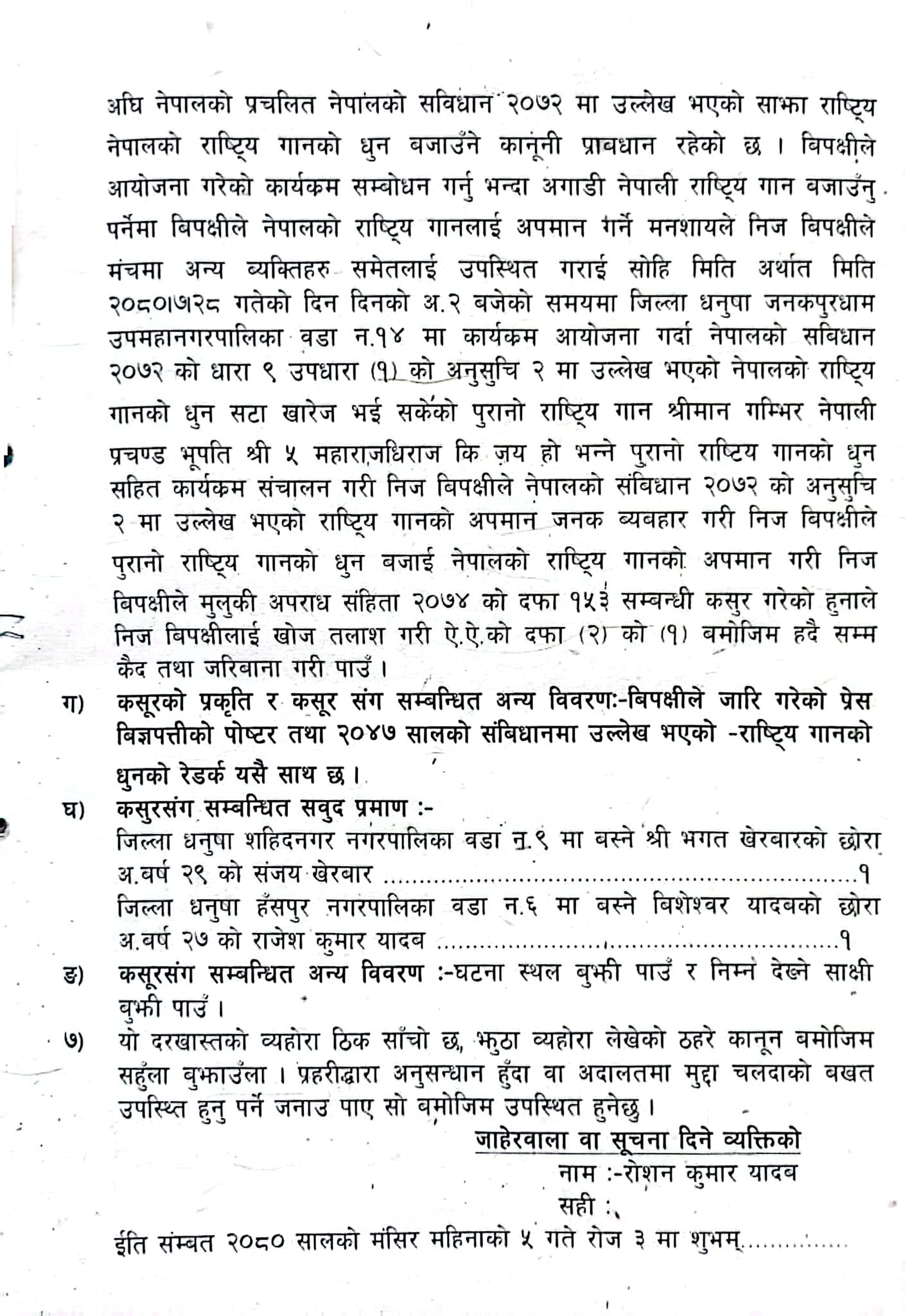 काठमाडौँ- युवा संघ नेपालले राष्ट्रियगान अपमान सम्बन्धी कसुर मुद्दामा दुर्गा प्रसाईविरुद्ध जिल्ला प्रहरी कार्यालय धनुषामा उजुरी दिएको छ। केही दिनअघि गरिएको एक कार्यक्रममा पुरानो राष्ट्रियगान बजाएर गणतन्त्रविरोधी क्रियाकलाप गरेको भन्दै प्रसाईलाई विपक्षी बनाएर युवा संघले धनुषा प्रहरीमा जाहेरी दिएको हो।