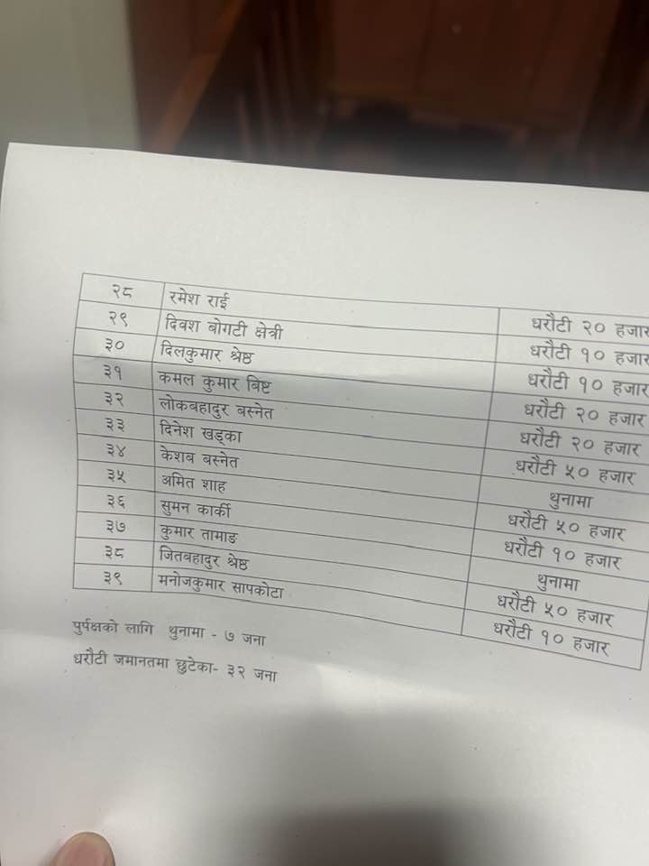 जिल्ला अदालतले पुर्पक्षका लागि थुनामा पठाइएकाहरुमा तारा राजावादी भन्ने सरोज गौतम, अनुप राजावादी भन्ने गोकर्ण शाही, डण्डपाणि रेग्मी, सुशील बराल, केशब बस्नेत र कुमार तामाङ छन्।