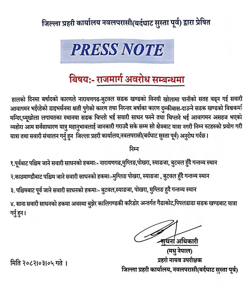 त्यसैगरी, साना सवारीसाधन भने सडकको अवस्था बुझेर कालीगण्डकी करिडोरको गैँडाकोट (नवलपुर) पिपलडाँडा (पाल्पा) सडक प्रयोग गर्न सकिने उनको भनाइ छ।