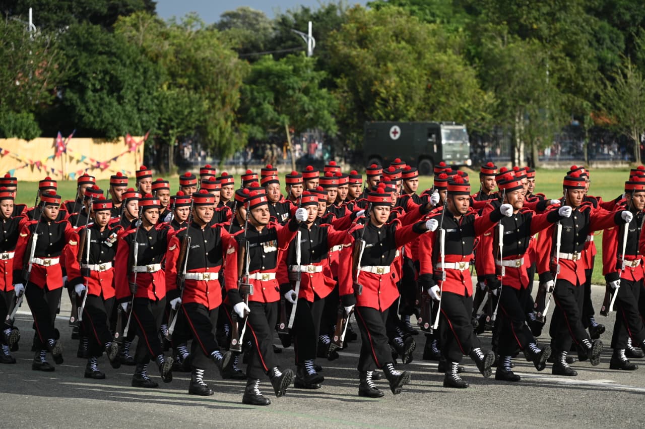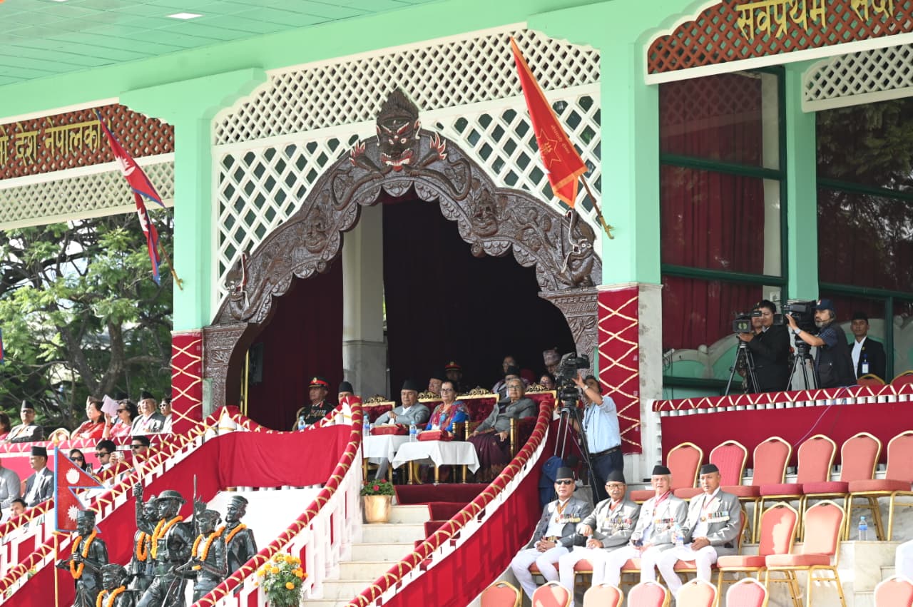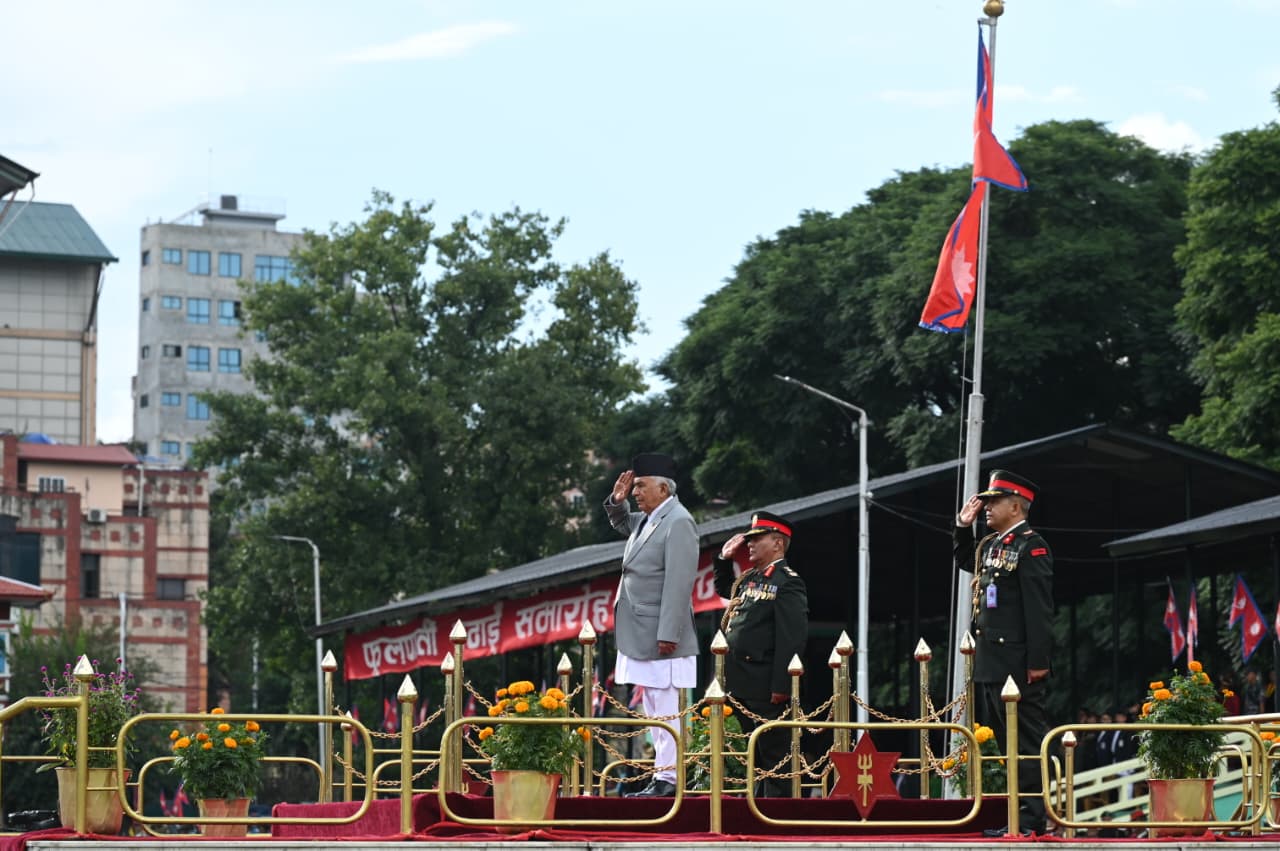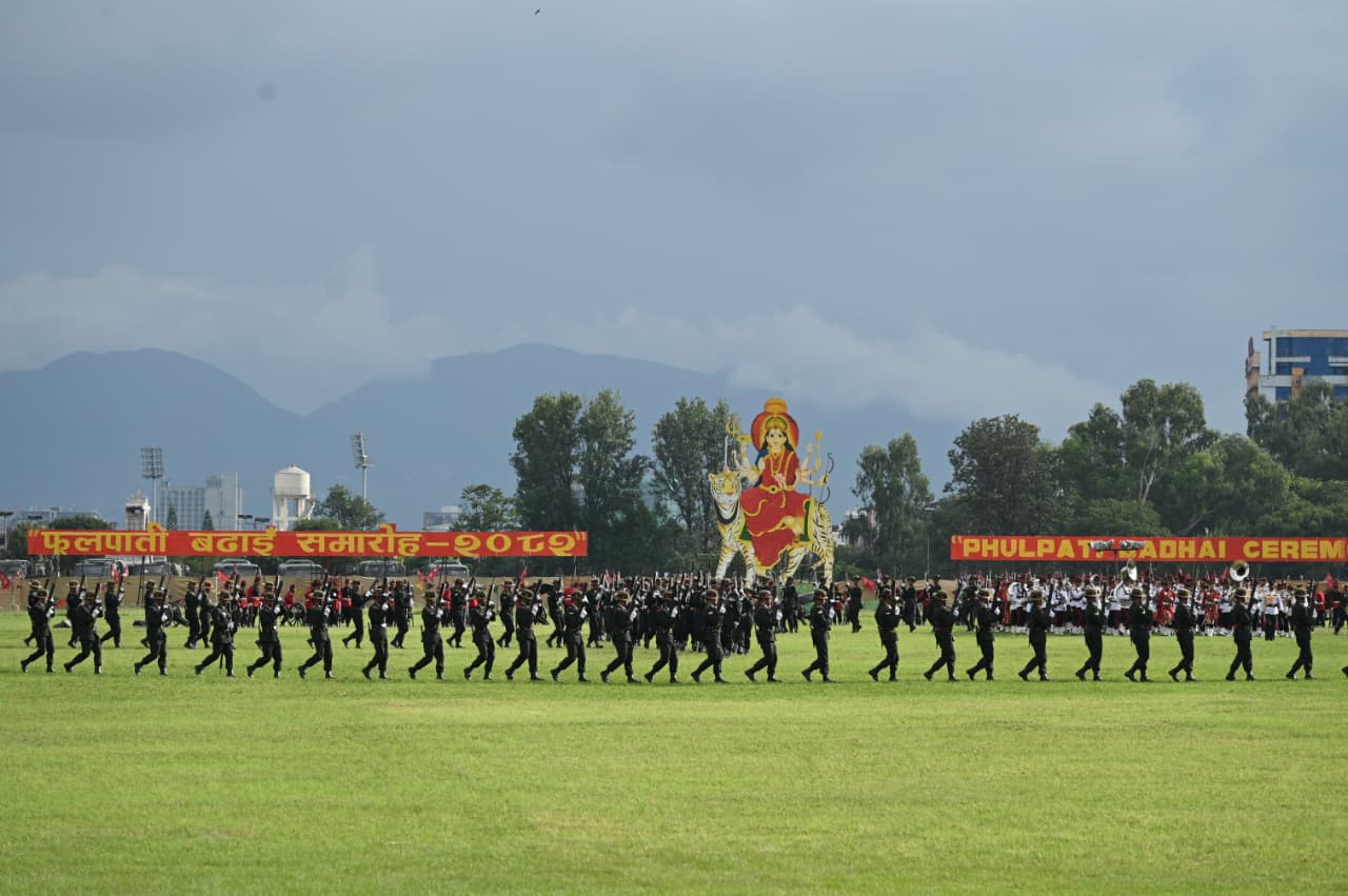 काठमाडौँ- राष्ट्रपति रामचन्द्र पौडेलको प्रमुख आतिथ्यमा सैनिक मञ्च टुँडिखेलमा सोमबार अपराह्न ‘फूलपाती बढाइँ समारोह-२०८२’ सम्पन्न गरिएको छ। समारोहमा नेपाली सेनाका परमाधिपति राष्ट्रपति पौडेलको सम्मानमा नेपाली सेनाले सलामी अर्पण गरेको थियो। सो समारोहमा सेनाको टोलीले राइफलबाट लहरे र एकठ्ठा तथा तोपबाट पनि बढाइँ गरेको थियो।