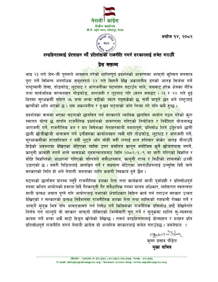 ‘…दल विशेषका नेताहरूमाथि बदलापूर्ण प्रतिशोध लिने उद्देश्यले छानीछानी आक्रमण गर्ने उनीहरूका कार्यालय तोडफोड, लुटपाट र आगजनी गर्ने, सुरक्षाकर्मीको हातहतियार र बर्दी लुट्ने अनि सोही बर्दि लगाई हातहतियार बोकेर आतंक फैलाउँदै हिँडेको अवस्थामा देखिएका व्यक्तिउपर प्रचलित कानुनबमोजिम कुनै खोजतलास नगर्ने, कानुनी कारबाही नगर्ने भन्ने आसयको गृह मन्त्रालयबाट असोज ९ मा जारी गरिएको विज्ञप्ति र सोही विज्ञप्तिको आधारमा गरिएको परिपत्रले संविधानवाद, कानुनी राज्य र विधिको शासनको धज्जी उडाएको छ। यसरी पीडितलाई आतंकित गर्ने र सप्रमाण भेटिएका अपराधिलाई उन्मुक्ति दिँदै जाने सरकारको नीति हो भने नेपाली जनताका लागि कदापि स्वीकार्य हुने छैन,’ कांग्रेसका मुख्य सचिव कृष्णप्रसाद पौडेलले विज्ञप्ति निकालेर भनेका छन्।