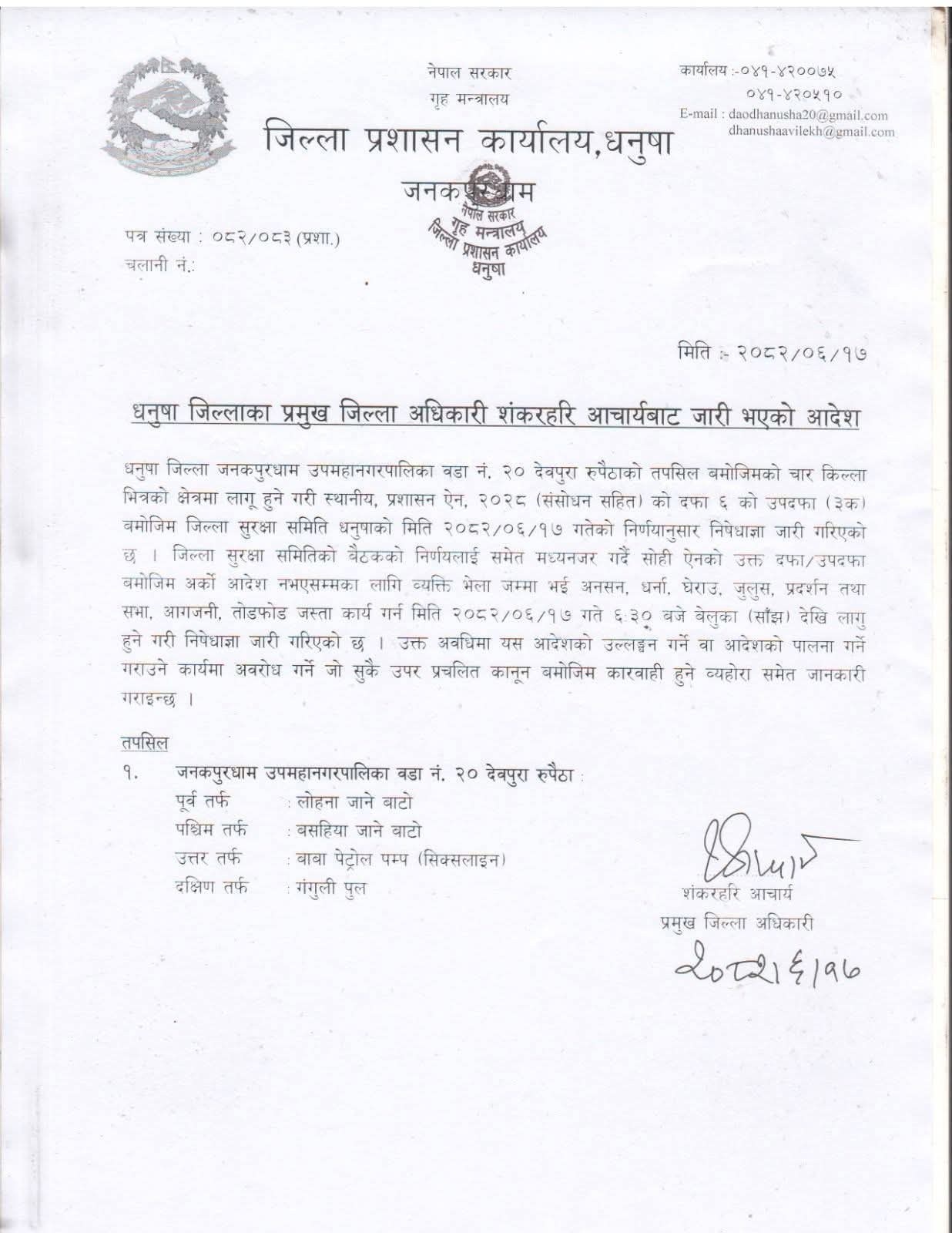 जिल्ला प्रशासन कार्यालयबाट जारी भएको आदेशअनुसार देवपुरा रुपैठा पूर्वतर्फ लोहना जाने बाटो, पश्चिमतर्फ बसहिया जाने बाटो, उत्तरतर्फ बाबा पेट्रोल पम्प (सिक्सलेन) र दक्षिणतर्फ गंगुली पुलसम्मको क्षेत्रमा निषेधाज्ञा लागू गरिएको हो।