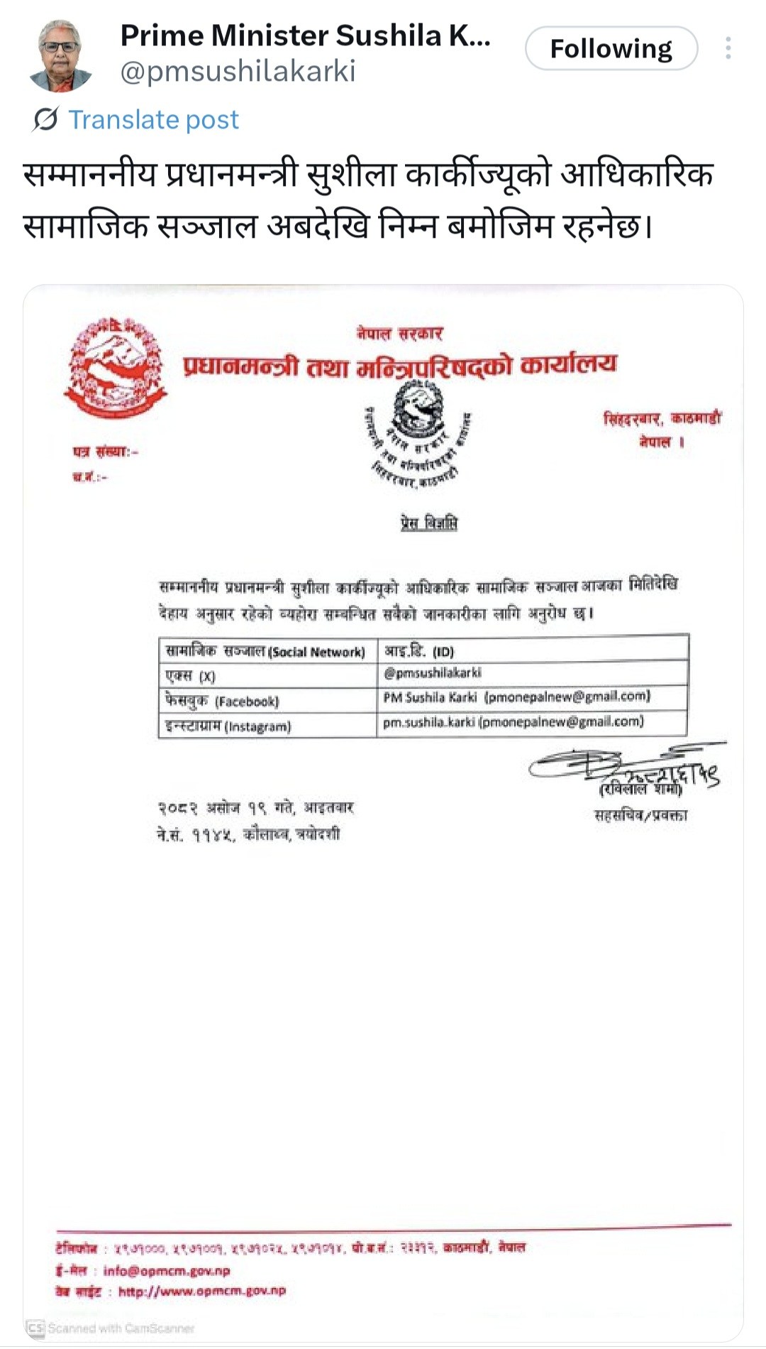 यसैबीच कार्की नेतृत्वको सरकारले प्रधानमन्त्रीका लागि सामाजिक सञ्जाल फेसबुक, ट्विटर र इन्स्टाग्राममा नयाँ एकाउन्ट खोलेको छ।