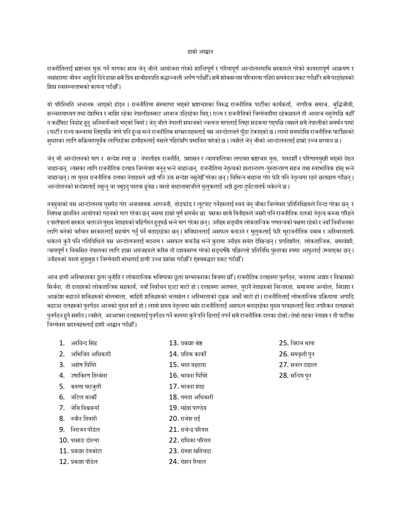 अरविन्द सिंह, अभिजित अधिकारी, अशेष घिमिरे, उषाकिरण तिम्सेना, जटिल कार्की, जेबि विश्वकर्मा, नवीन तिवारीलगायतका राजनीतिकर्मीहरू मंगलबार संयुक्त वक्तव्य निकालेर यस्तो आह्वान गरेका हुन्।