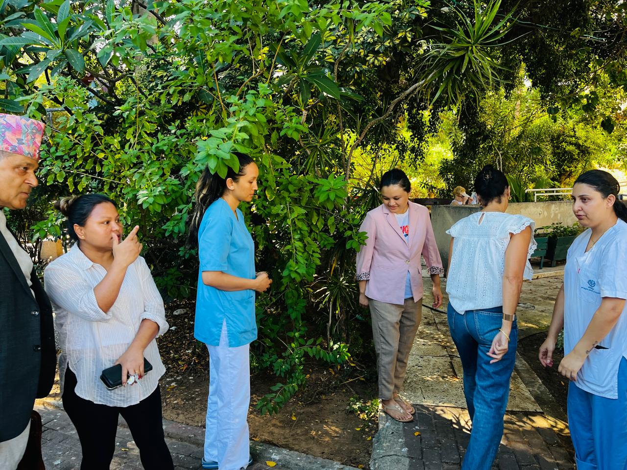 एयरपोर्टमा उत्रनेबित्तिकै हामीलाई दुईजना इजरायली अधिकारीले अध्यागमन प्रक्रियामा सहयोग गरे। लगेज लिने ‘बेल्ट’ मा पुग्दा इजरायलका लागि नेपाली राजदूत धनप्रसाद पण्डित, नेपालका लागि पूर्वइजरायली राजदूत हनान गोदेर, इजरायली दूतावास काठमाडौँकी नियोग उपप्रमुख जनान बेबर र अन्य केही अधिकारीहरू स्वागतका लागि तयार रहेछन्। उनीहरूसँग परिचय आदानप्रदानका साथै केही भलाकुसारी र तस्बिर खिच्ने काम भए। अनि जनानले अध्यागमनबाट उपलब्ध ‘डिटेल कार्ड’ नहराउन आग्रह गरिन्। उनै जनान एक सातासम्म हाम्रो टोलीको संयोजकका रूपमा थिइन्।