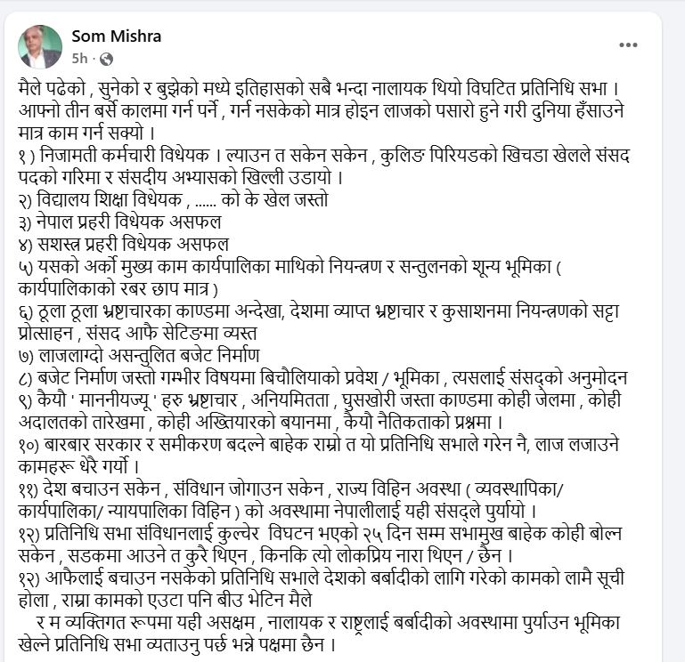 मिश्रले विघटित प्रतिनिधिसभालाई ‘इतिहासकै सबैभन्दा नालायक’ सभा भएको टिप्पणी गर्दै सामाजिक सञ्जाल फेसबुकमा भने,‘मैले पढेको, सुनेको र बुझेको मध्ये इतिहासकै नालायक थियो त्यो प्रतिनिधिसभा। तीन वर्षको अवधिमा गर्नुपर्ने काम गर्न त सकेन नै उल्टै लाजमर्दो र हास्यास्पद काम गरेर देश र जनतालाई निराश बनायो।’