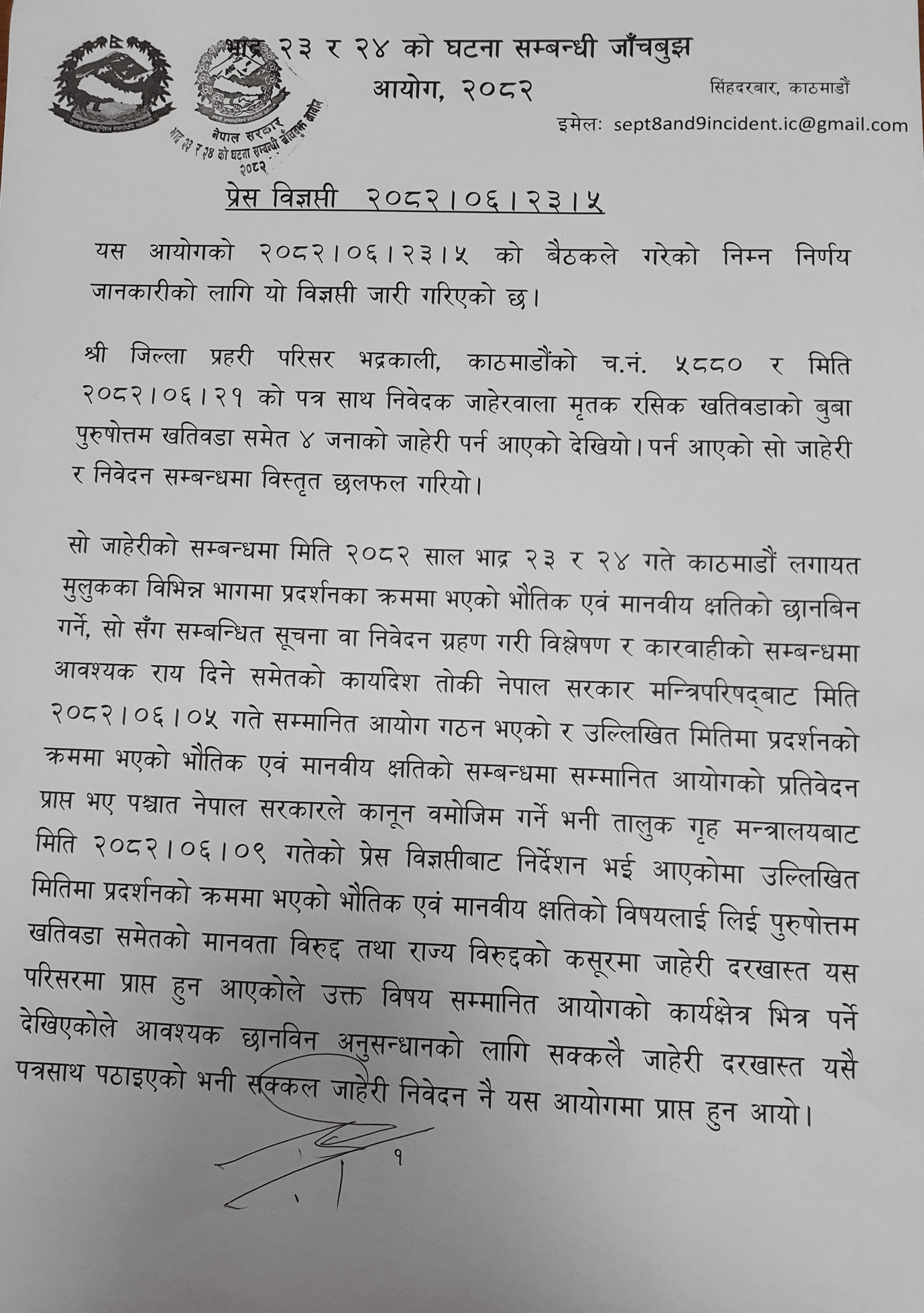 भदौ २३ र २४ गतेका घटना छानबिन गर्न उच्चस्तरीय आयोग गठन भइसकेकाले जाहेरी लिन नमिल्ने भन्दै प्रहरीले आयोगमा पठाएको थियो। उच्चस्तरीय छानबिन समिति गठन भइसकेको अवस्थामा जाहेरी लिएर अनुसन्धान गर्नु आफूहरूको अधिकारक्षेत्रभन्दा बाहिर रहेको प्रहरीको भनाइ थियो।