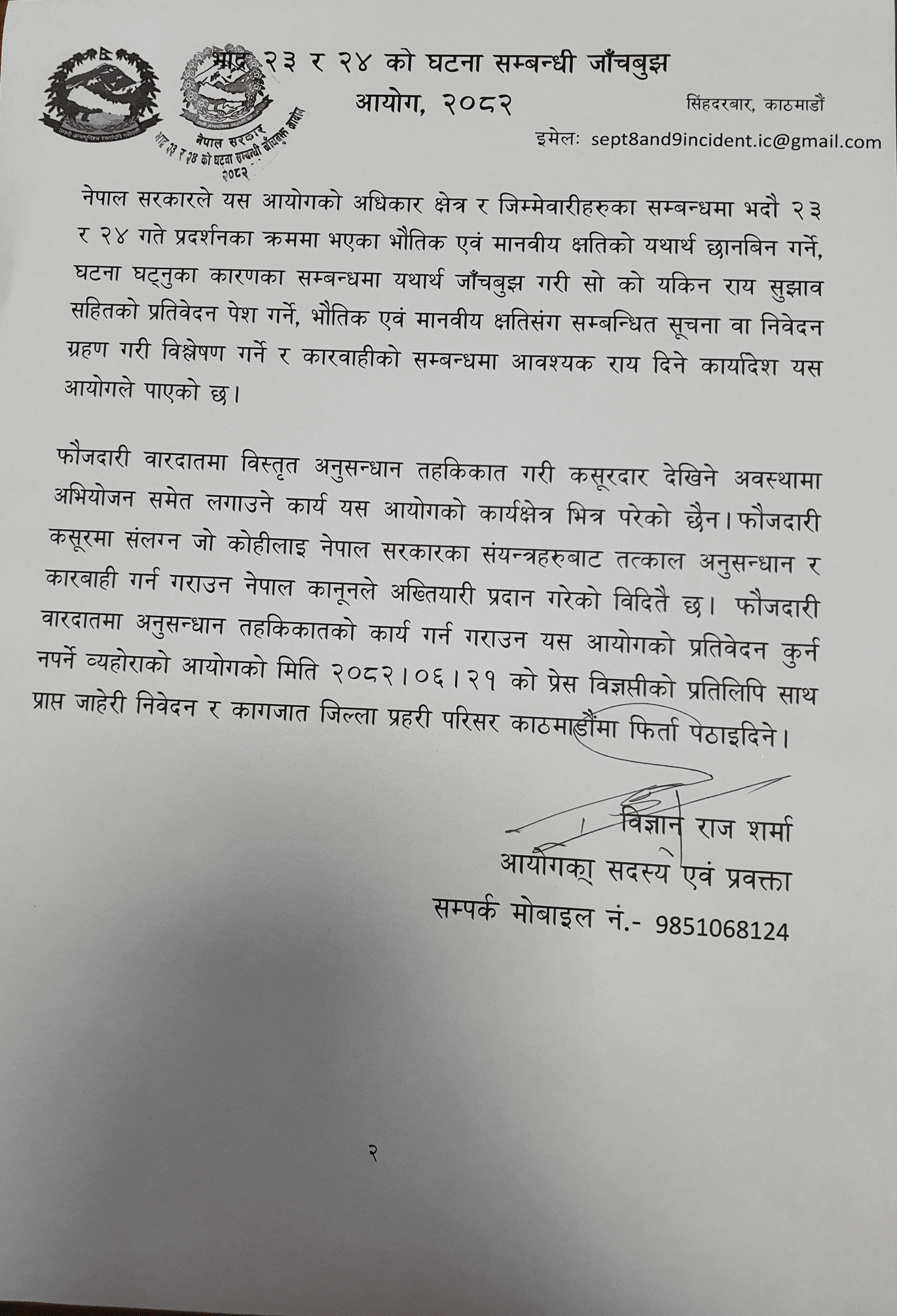 शर्माले जारी गरेको विज्ञप्तिमा भनिएको छ,‘नेपाल सरकारले यस आयोगको अधिकार क्षेत्र र जिम्मेवारीहरूका सम्बन्धमा भदौ २३ र २४ गते प्रदर्शनका क्रममा भएका भौतिक एवं मानवीय क्षतिको यथार्थ छानबिन गर्ने, घटना घट्नुका कारणका सम्बन्धमा यथार्थ जाँचबुझ गरी सो को यकिन राय सुझावसहितको प्रतिवेदन पेस गर्ने, भौतिक एवं मानवीयता क्षतिसँग सम्बन्धित सूचना वा निवेदन ग्रहण गरी विश्लेषण गर्ने र कारबाहीको सम्बन्धमा आवश्यक राय दिने कार्यदेश यस आयोगले पाएको छ।’