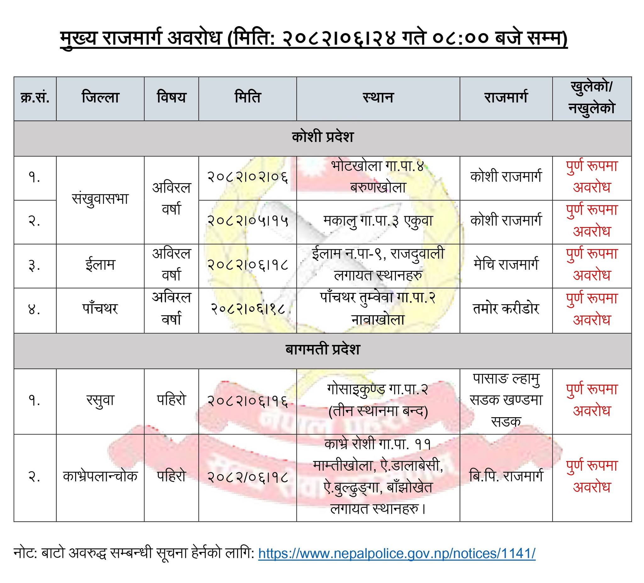 यी सबै स्थानमा निरन्तर वर्षाका कारण पहिरो खस्दा सडक बन्द भएका हुन्। सम्बन्धित निकायले सडक खुलाउने काम सुरु गरेको भए पनि कतिपय स्थानमा पहिरो ठूलो भएकाले आवागमन सामान्य हुन केही समय लाग्ने बताइएको छ।