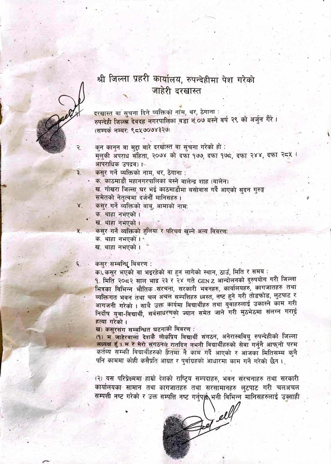 भदौ २३ र २४ गते जेनजी आन्दोलनको दुरुपयोग गरी रूपन्देहीमा क्षति गराएको भन्दै अनेरास्ववियूले किटानी जाहेरी दिएको हो।