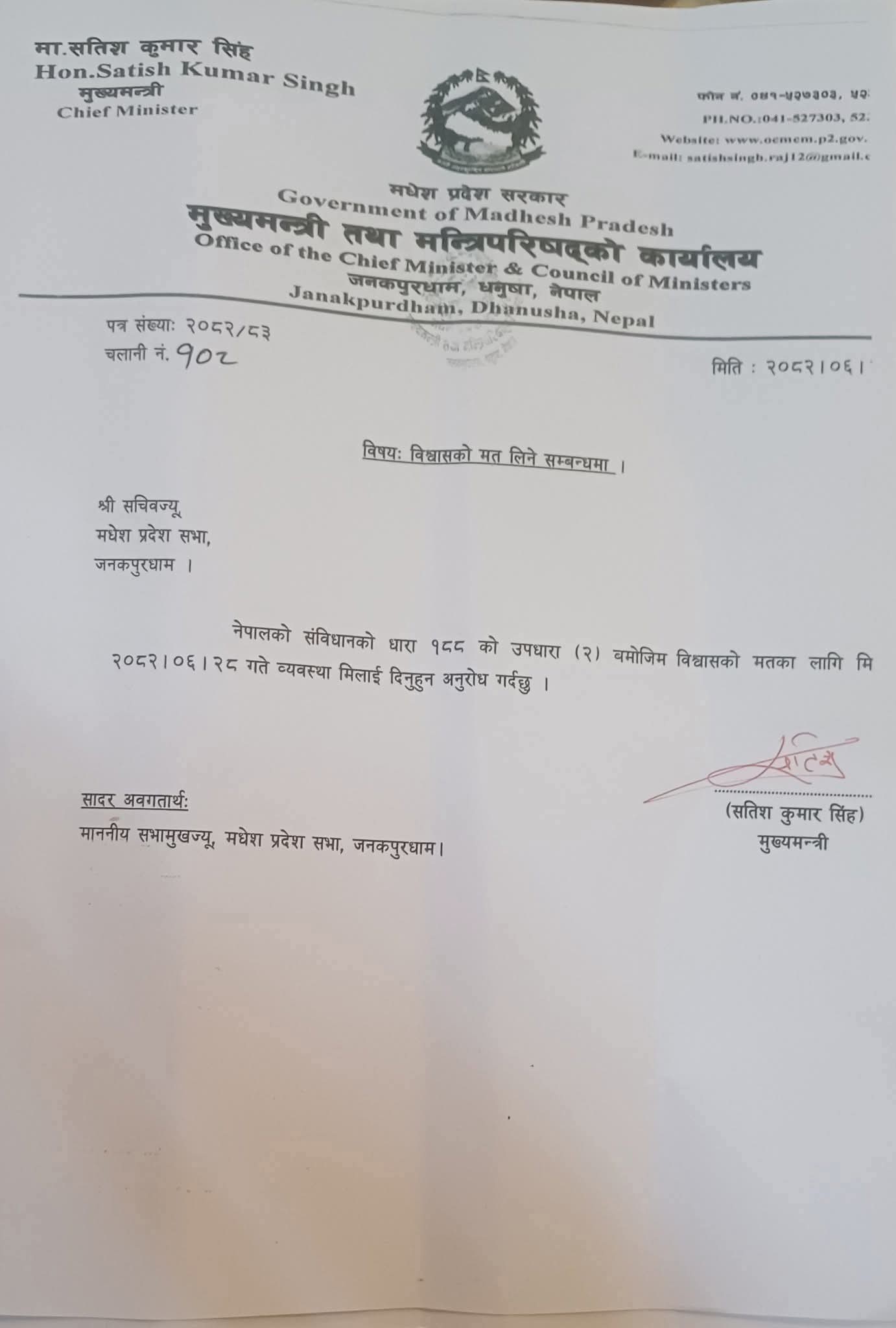‘नेपालको संविधानको धारा १८८ को उपधारा (२) बमोजिम विश्वासको मतका लागि मिति २०८२/०६/२८ गते व्यवस्था मिलाइ दिनुहुन अनुरोध गर्दछु,’ मुख्यमन्त्री सिंहले प्रदेशसभा सचिवालयलाई पठाएको पत्रमा उल्लेख छ।