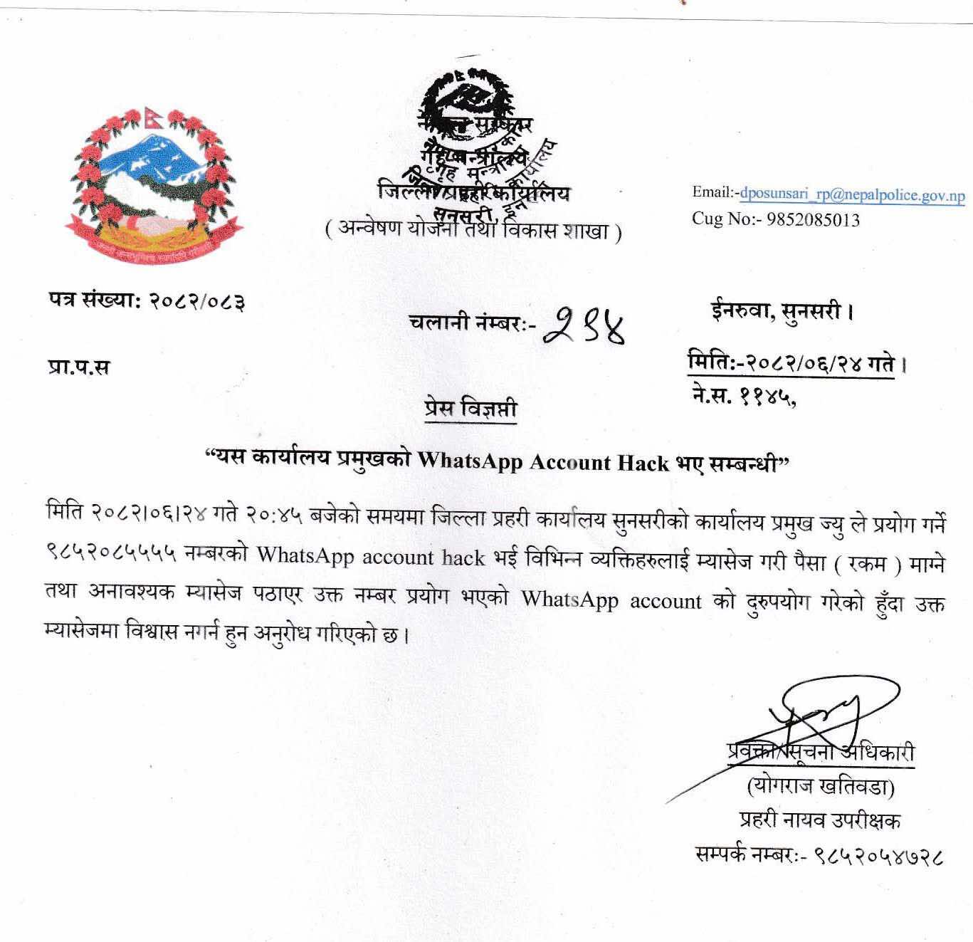जिल्ला प्रहरी कार्यालयका प्रवक्ता डीएसपी योगराज खतिवडाले सूचना जारी गर्दै भनेका छन्, ‘जिल्ला प्रहरी कार्यालय सुनसरीको कार्यालय प्रमुखज्यूले प्रयोग गर्ने ९८५२०८५५५५ नम्बरको ह्वाट्सएप एकाउन्ट ह्याक भई विभिन्न व्यक्तिहरूलाई म्यासेज गरी पैसा (रकम) माग्ने तथा अनावश्यक म्यासेज पठाएर उक्त नम्बर प्रयोग भएको ह्वाट्सएप एकाउन्टको दुरुपयोग गरेको हुँदा उक्त म्यासेजमा विश्वास नगर्न हुन अनुरोध गरिएको छ।’