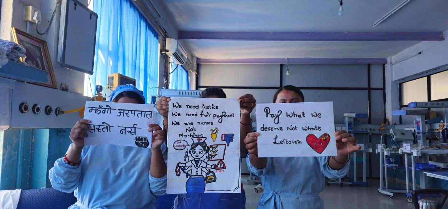 ‘हामी मेसिन होइनौँ’, ‘नो नर्स, नो केयर’, हामीलाई न्याय चाहियो’, ‘महँगो अस्पताल सस्तो नर्स’, ‘श्रम शोषण बन्द गर’ लगायतका नाराअंकित प्ले–कार्डसमेत उनीहरुले बोकेका थिए।