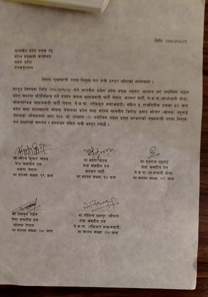 तर जनमतले कांग्रेस-एमालेको साथ छाडेपछि आज छुट्टै गठबन्धन बनेको हो। १०७ सदस्य प्रदेशसभा सरकार बनाउन ५४ सिट आवश्यक पर्छ ।