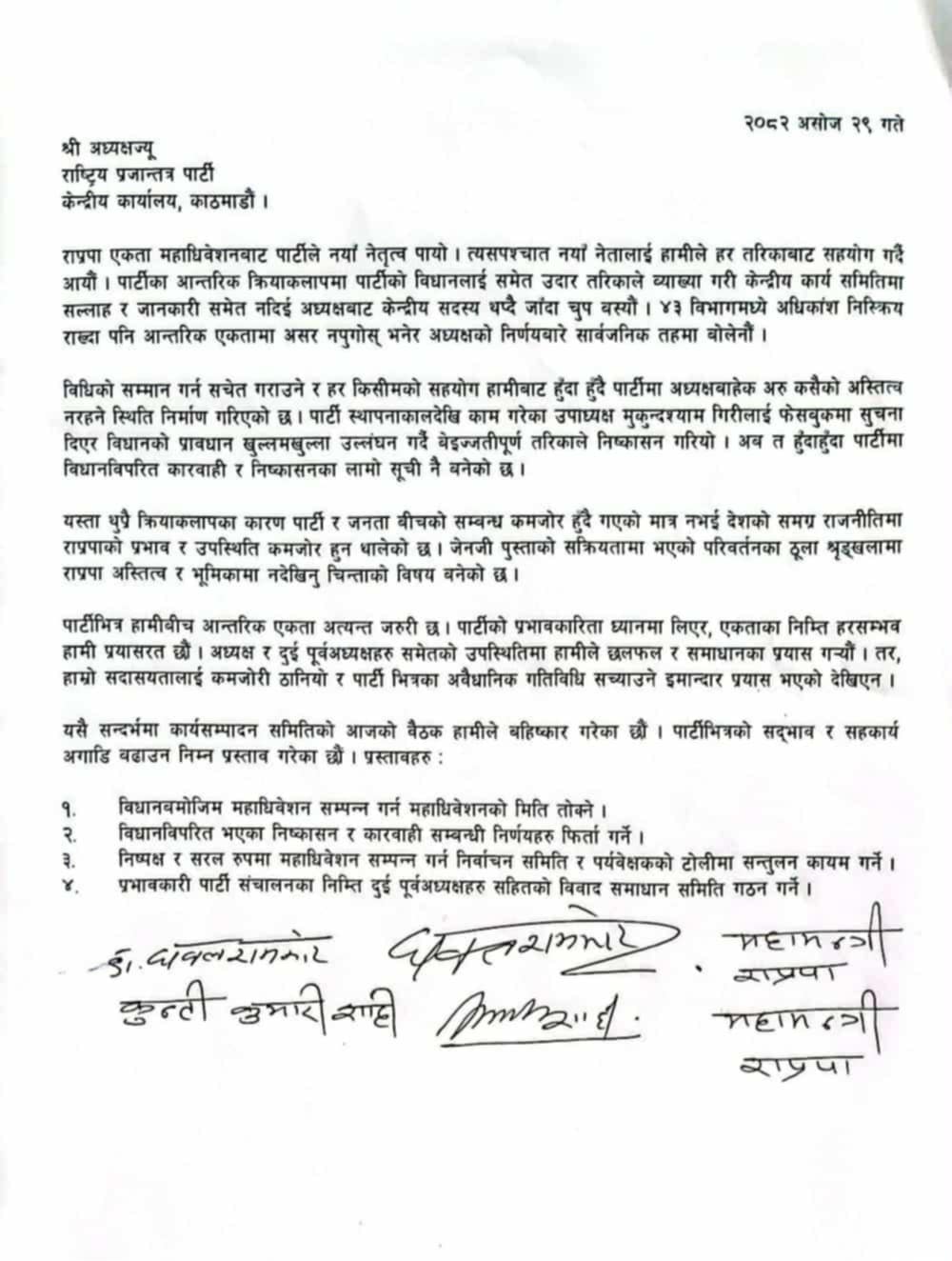 विधिको सम्मान गर्न सचेत गराउने र हर प्रकारको सहयोग गर्न तयार रहँदा समेत पार्टीमा अध्यक्षबाहेक अरु कसैको अस्तित्व नरहने स्थिति निर्माण गरिएको पत्रमा उल्लेख छ।