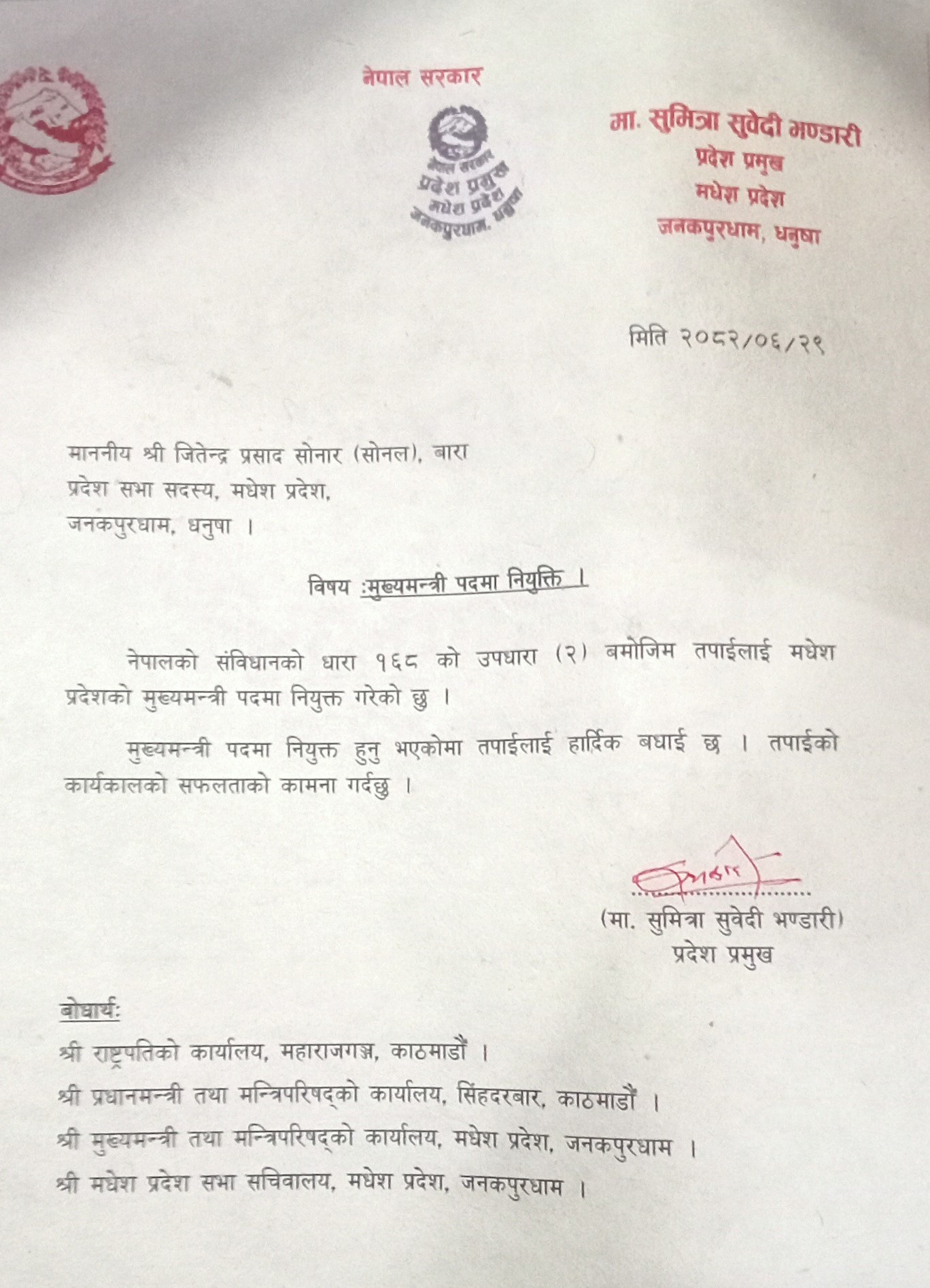 ‘नेपालको संविधानको धारा १६८ को उपधारा (२) बमोजिम तपाईँलाई मधेश प्रदेशको मुख्यमन्त्री पदमा नियुक्त गरेको छु,’ प्रदेश प्रमुख भण्डारीले मुख्यमन्त्री नियुक्तिपत्रमा उल्लेख गरेकी छन्।
