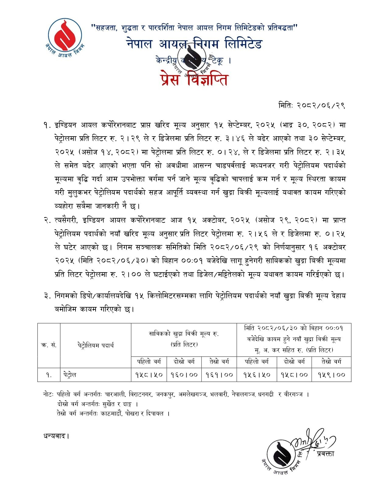यसपटक डिजेल, मट्टितेल र  हवाई इन्धन (एटीएफ) को मूल्य यथावत् राखिएको निगमले जनाएको छ।