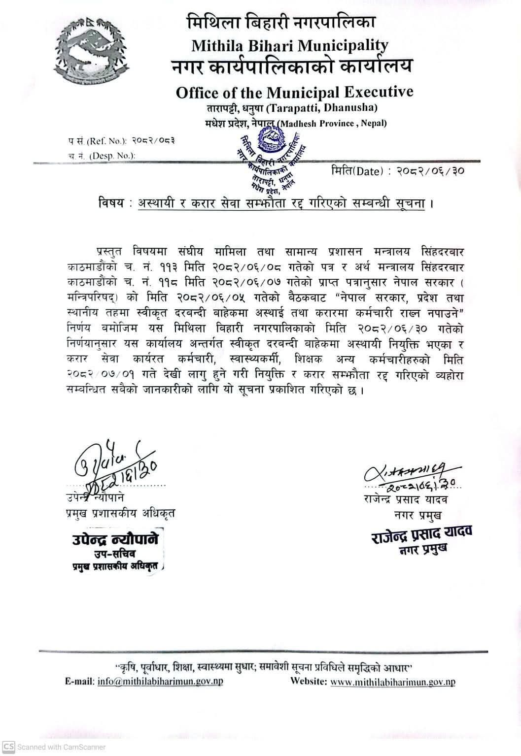 काठमाडौँ- सरकारको हालैको निर्णयअनुसार मिथिला बिहारी नगरपालिकाले स्वीकृत दरबन्दी बाहेकका अस्थायी तथा करार सेवामा कार्यरत कर्मचारीहरूको नियुक्ति र सेवा सम्झौता रद्द गरेको छ।