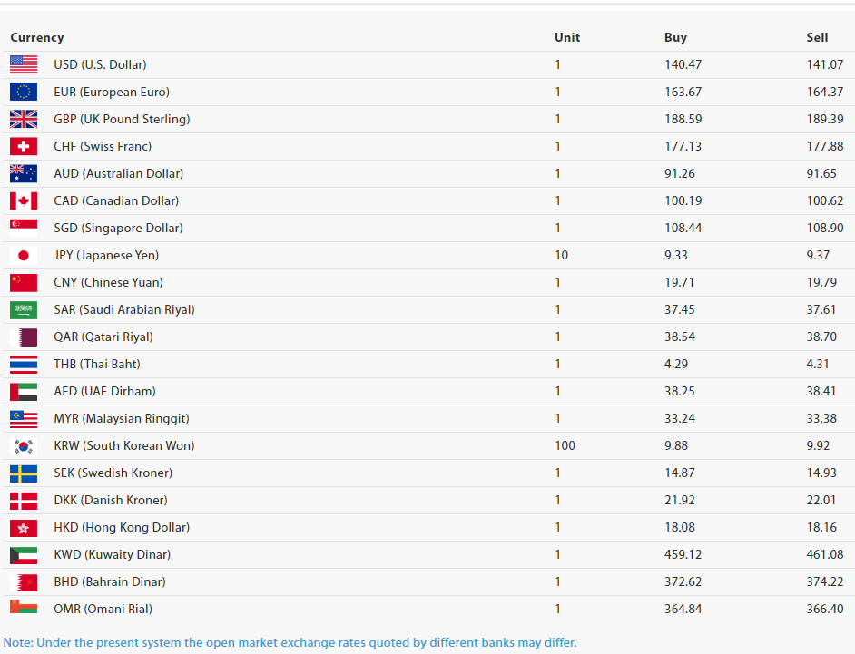 आज अमेरिकी डलर १ को खरिदर १४० रुपैयाँ ४७ पैसा र बिक्रीदर १४१ रुपैयाँ ०७ पैसा छ। आज युरो १ को खरिदर १६३ रुपैयाँ ६७ पैसा र बिक्रीदर १६४ रुपैयाँ ३७ पैसा छ। आज पाउन्ड स्ट्रलिङ १ को खरिदर १८८ रुपैयाँ ५९ पैसा र बिक्रीदर १८९ रुपैयाँ ३९ पैसा छ।