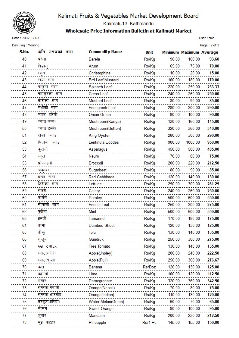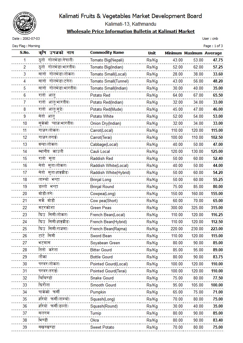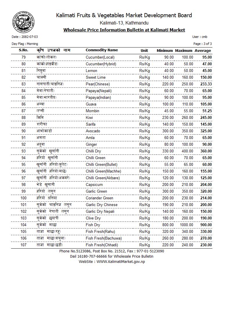 करेला ९०, लौका ८७, लोकल परबल १०४, घिरौँला १०४, डल्ले फर्सी ३६, पाकेको फर्सी ७०, कन्य च्याउ १५२, डल्ले च्याउ ३४८, कुरिलो ४७५, ब्रोकाउली २५० रुपैयाँ प्रतिकिलो थियो।