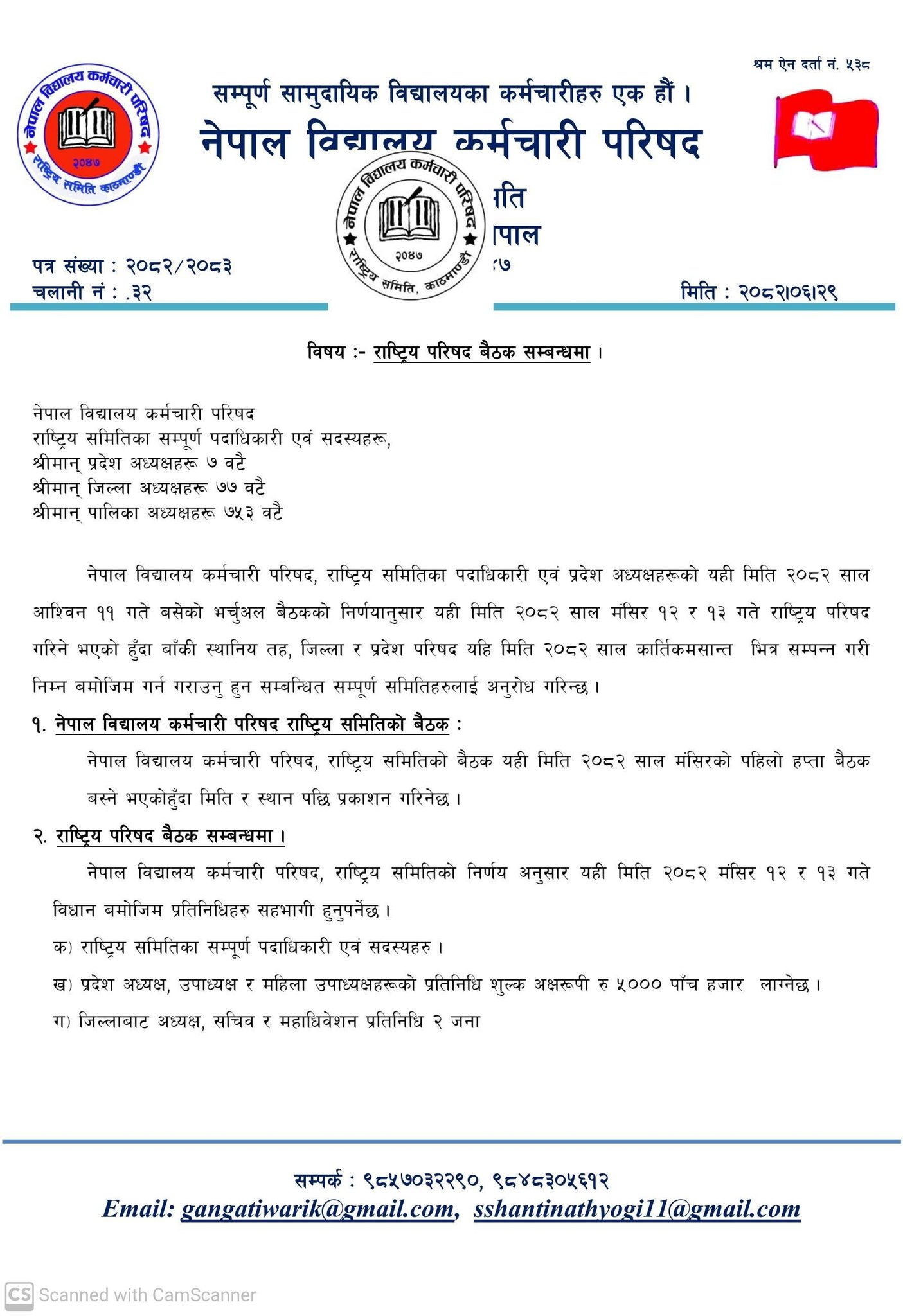 विद्यालय कर्मचारीको राष्ट्रिय परिषद् बैठक मंसिर १२ र १३ गते, शुल्क पनि तोकियो