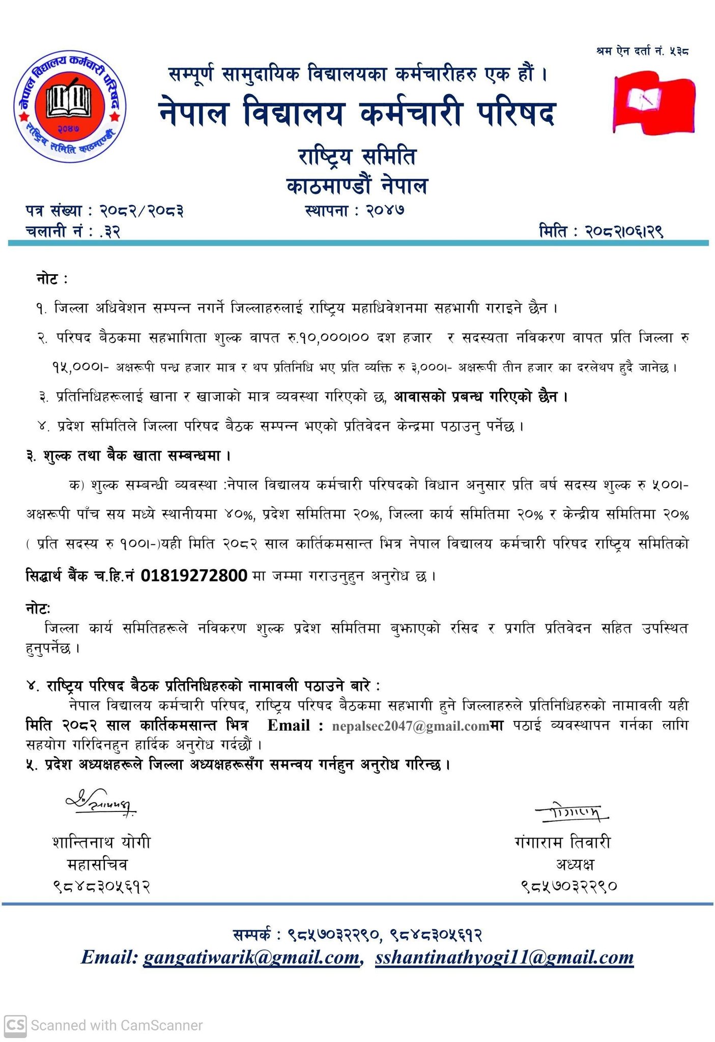 यस्तै, जिल्लाहरूले नविकरण शुल्कको रसिद र प्रगति प्रतिवेदन सहित राष्ट्रिय परिषद्मा उपस्थित हुनुपर्नेछ। बैठकमा सहभागी हुने प्रतिनिधिहरूको नामावली पनि कात्तिक मसान्तभित्र [email protected] मा पठाउन आग्रह गरिएको छ।