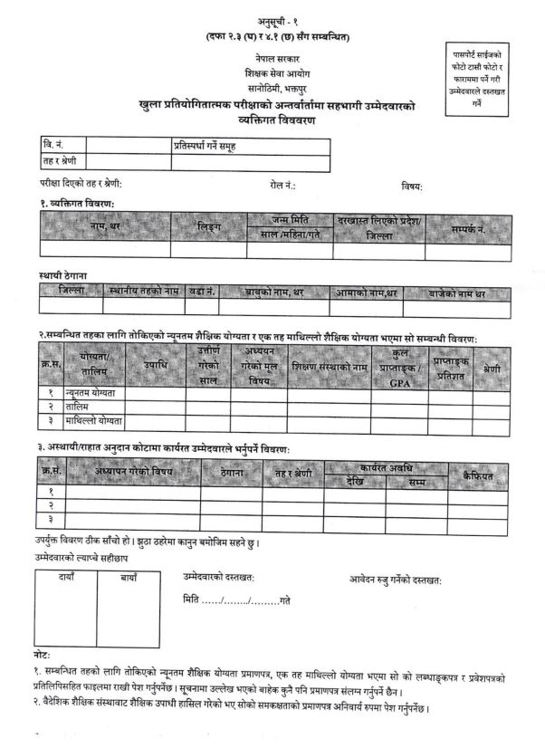 आयोगका अनुसार उम्मेदवारले फाराममा आफ्नो स्थायी ठेगाना, शैक्षिक योग्यता र सेवा अनुभवसम्बन्धी विवरण उल्लेख गर्नुपर्नेछ। विशेषगरी सम्बन्धित तहका लागि तोकिएको न्यूनतम शैक्षिक योग्यता तथा सोभन्दा माथिल्लो तहको शैक्षिक योग्यता प्राप्त भएमा त्यसको स्पष्ट विवरण फाराममा समावेश गर्नु पर्नेछ।
