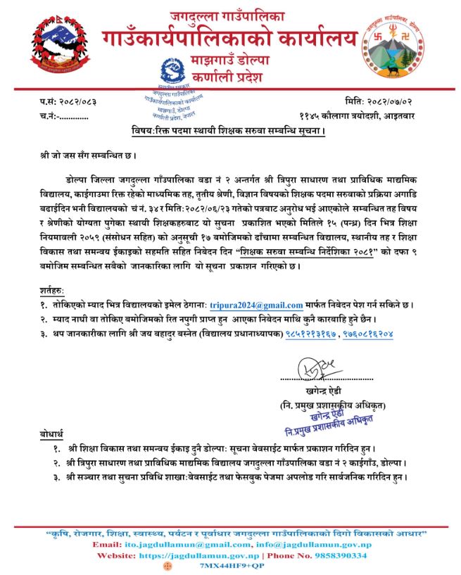 डोल्पा- जगदुल्ला गाउँपालिका-२ स्थित त्रिपुरा साधारण तथा प्राविधिक माध्यमिक विद्यालय, काईगाउँमा रिक्त रहेको निम्न माध्यमिक तह, तृतीय श्रेणी, नेपाली विषयको स्थायी शिक्षक पदमा सरुवाको प्रक्रिया अगाडि बढाइएको छ।