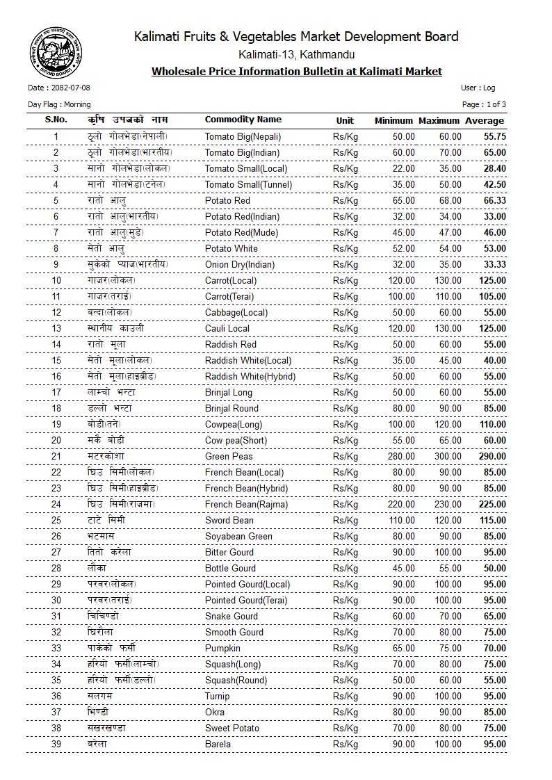करेला ९५, लौका ६५, लोकल परबल ९५, घिरौँला ७५, डल्ले फर्सी ४५, पाकेको फर्सी ७०, कन्य च्याउ १९०, डल्ले च्याउ ३९०, कुरिलो ४७६, ब्रोकाउली १९० रुपैयाँ प्रतिकिलो थियो।