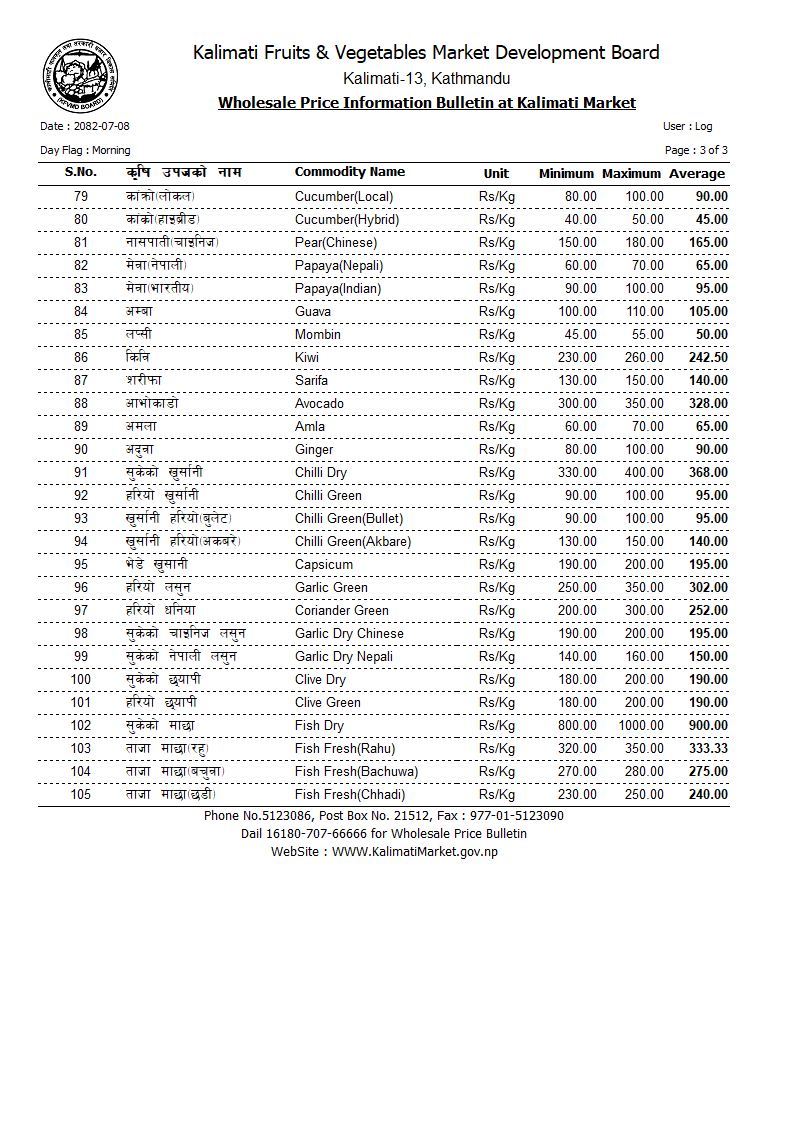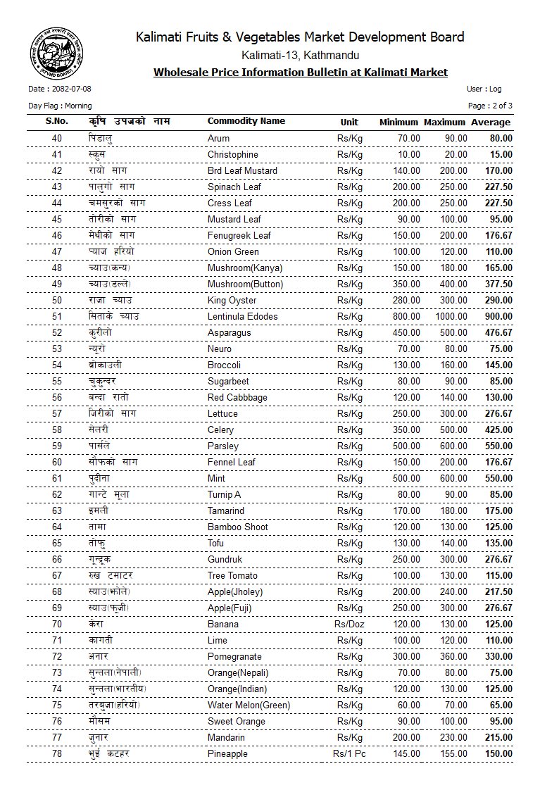 करेला ९५, लौका ५०, लोकल परबल ९५, घिरौँला ७५, डल्ले फर्सी ५५, पाकेको फर्सी ७०, कन्य च्याउ १९०, डल्ले च्याउ ३७७, कुरिलो ४७६, ब्रोकाउली १४५ रुपैयाँ प्रतिकिलो छ।