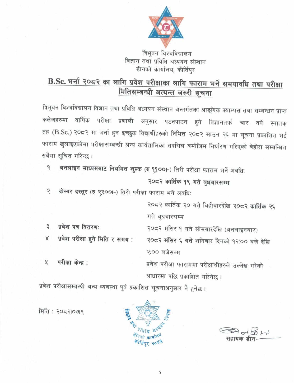 काठमाडौँ- त्रिभुवन विश्वविद्यालय विज्ञान तथा प्रविधि अध्ययन संस्थान डीनको कार्यालय, कीर्तिपुरले स्नातक तह (बीएस्सी) को प्रवेश परीक्षासम्बन्धी फाराम भर्ने समयसीमा र परीक्षा मिति सार्वजनिक गरेको छ।
