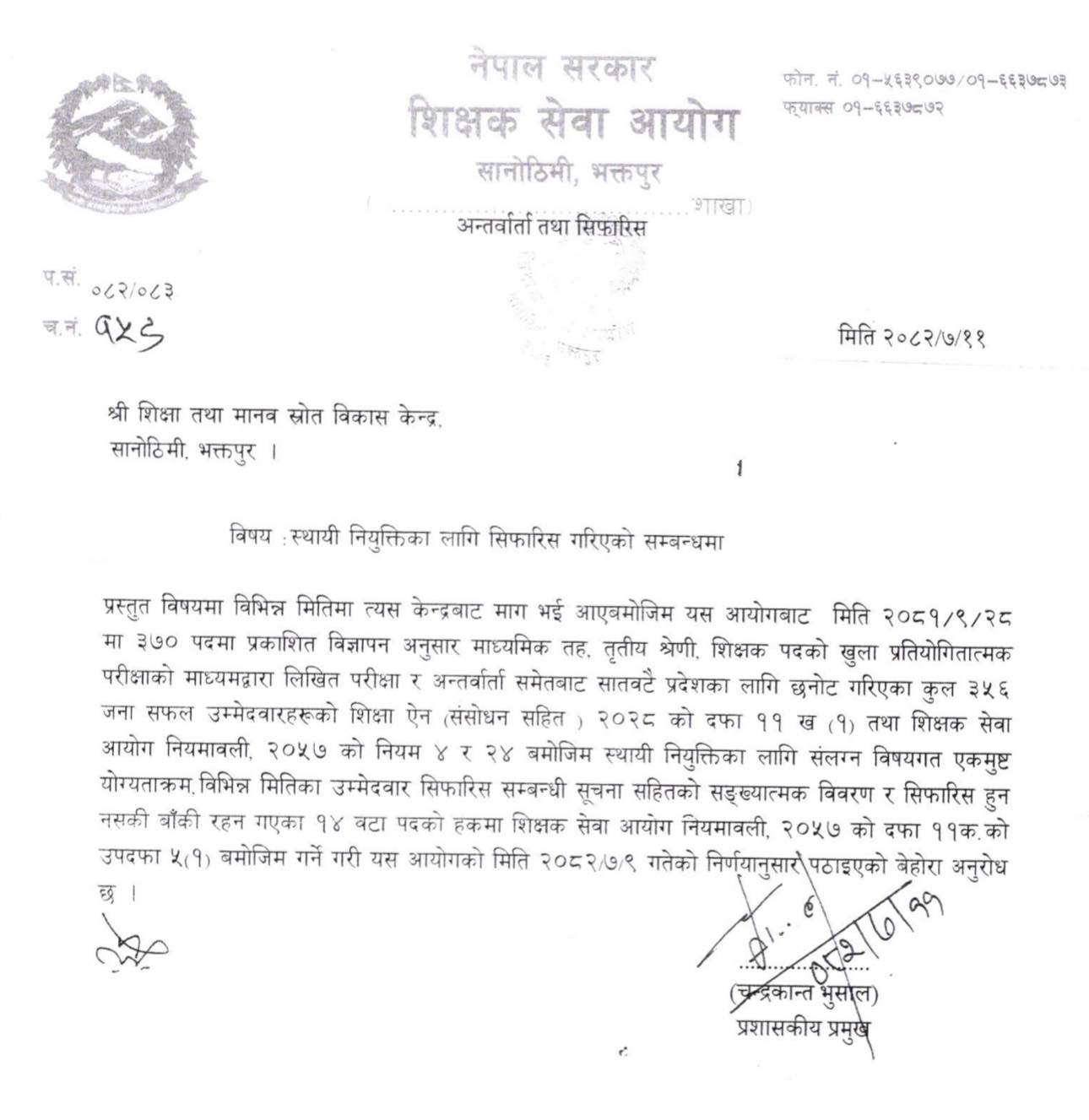 आयोगका प्रशासकीय प्रमुख चन्द्रकान्त भुसालले उक्त सिफारिसको विवरण शिक्षा तथा मानव स्रोत विकास केन्द्र, सानोठिमी, भक्तपुरमा पठाइएको जानकारी दिएका छन्।