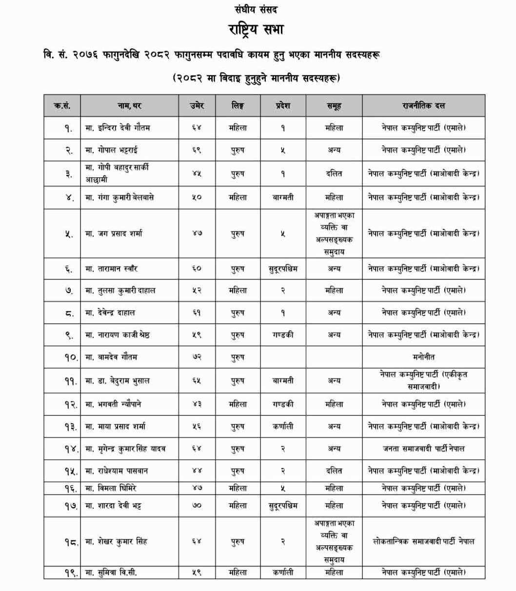 २०७६ मा राष्ट्रियसभा सदस्य बनेका वामदेव गौतम, नारायणकाजी श्रेष्ठ, डा. वेदुराम भुसालसहित १९ जनाको कार्यकाल आगामी फागुनमा सकिँदैछ।