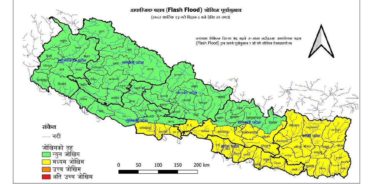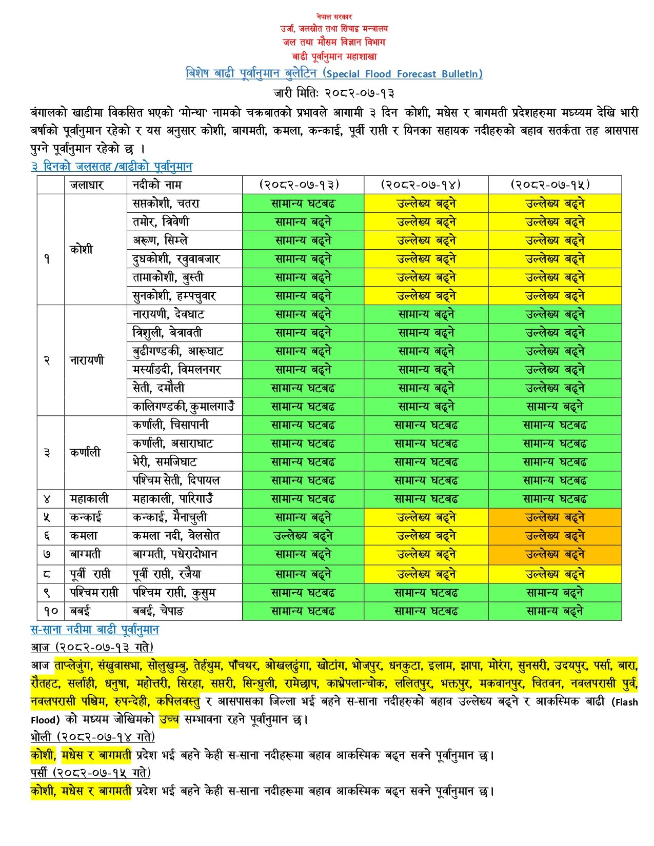 आज ताप्लेजुङ, संखुवासभा, सोलुखुम्बु, तेह्रथुम, पाँचथर, ओखलढुंगा, खोटाङ, भोजपुर, धनकुटा, इलाम, झापा, मोरङ, सुनसरी, उदयपुर, पर्सा, बारा, रौतहट, सर्लाही, धनुषा, महोत्तरी, सिराहा, सप्तरी, सिन्धुली, रामेछाप, काभ्रेपलान्चोक, ललितपुर, भक्तपुर, मकवानपुर, चितवन, नवलपरासी पूर्व, नवलपरासी पश्चिम, रुपन्देही, कपिलवस्तु र आसपासका जिल्ला भई बग्ने ससाना नदीहरूको बहाव उल्लेख्य बढ्ने र आकस्मिक बाढी आउन सक्ने महाशाखाले जनाएको छ ।