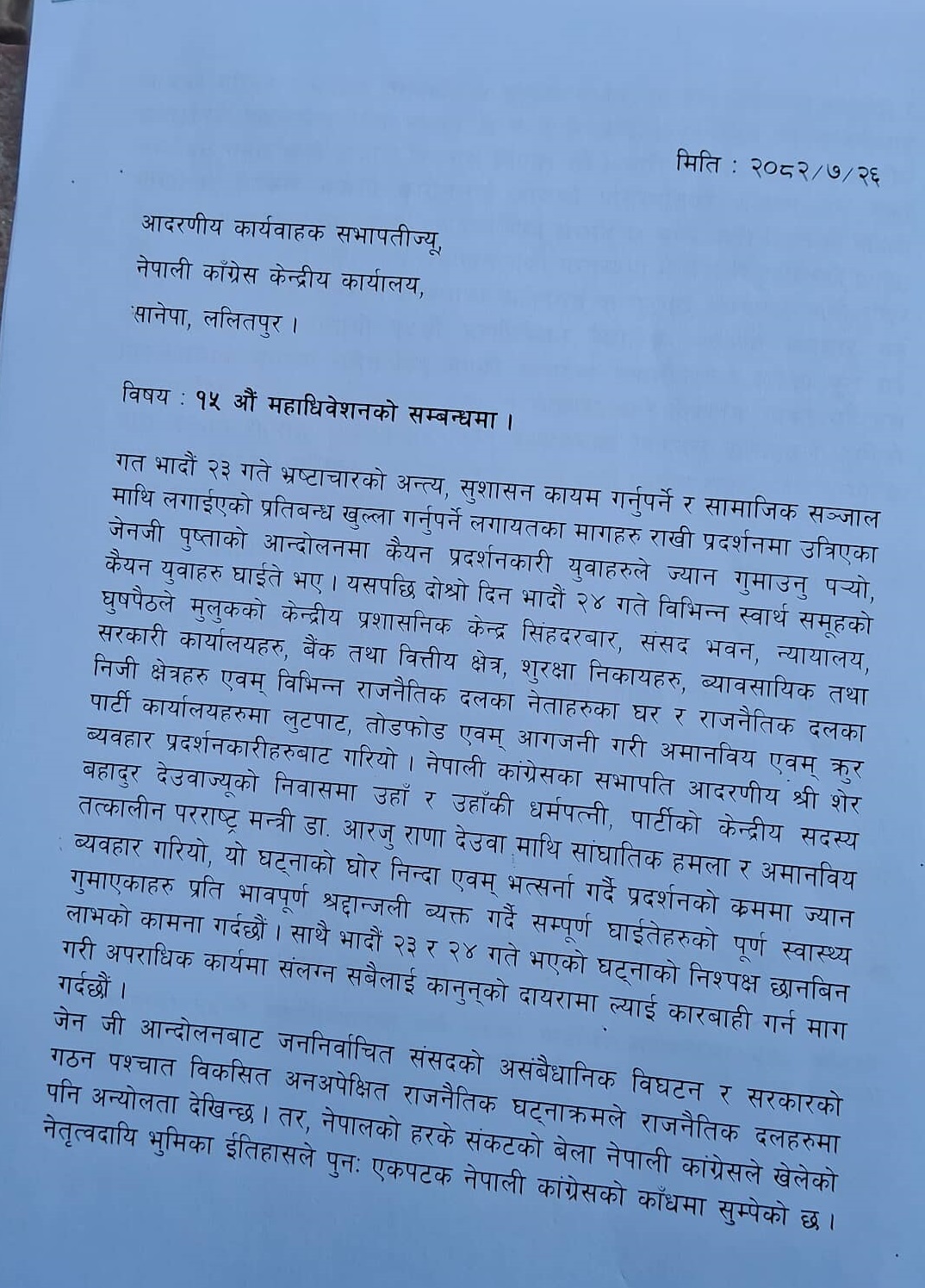 ज्ञापनपत्रमा भनिएको छ,‘आसन्न २०८२ फागुन २१ गतेको निर्वाचनलाई सफल बनाउन पार्टी विधानअनुसार १५औँ महाधिवेशन मंसिरभित्रै प्रारम्भ गरी तहगत रूपमा अधिवेशन सम्पन्न गर्ने कार्यतालिका तय गरी लागू गर्नुपर्छ।’