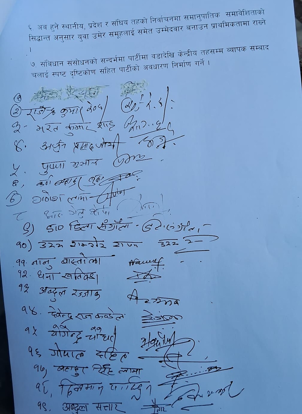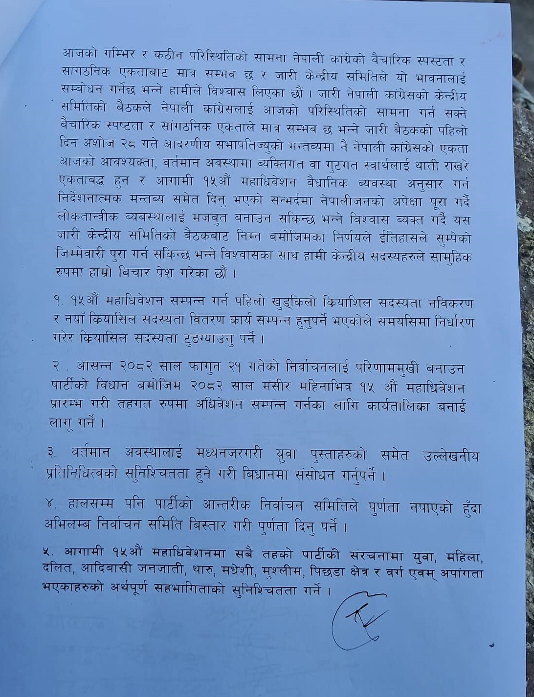 यससँगै युवाको उल्लेखनीय प्रतिनिधित्व सुनिश्चित हुने गरी पार्टी विधान संशोधन गर्नुपर्ने, आन्तरिम निर्वाचन समितिलाई तत्काल पूर्णता दिनुपर्ने र १५औँ महाधिवेशनमा युवा, महिला, दलित, आदिवासी जनजाति, थारू, मधेशी, मुस्लिम, पिछडिएका क्षेत्रका नागरिक तथा अपांगता भएका व्यक्तिहरूको अर्थपूर्ण सहभागिता सुनिश्चित गर्नुपर्ने जस्ता विषयहरू पनि समावेश छन्।