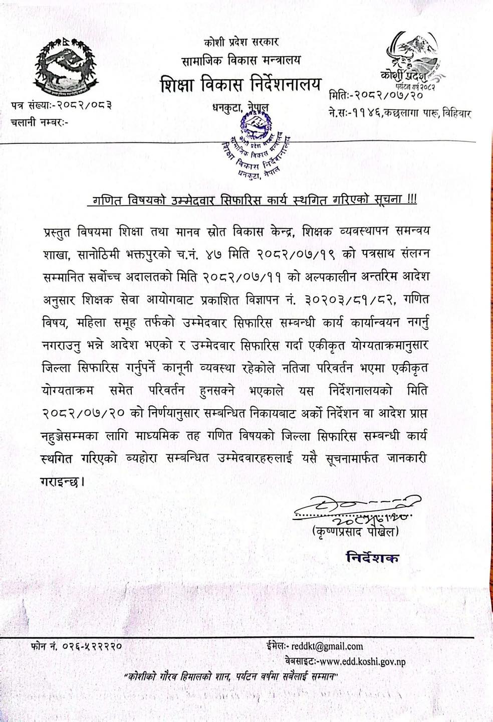 सर्वोच्च अदालतको आदेशमा शिक्षक सेवा आयोगद्वारा प्रकाशित विज्ञापन नं.३०२०३/८१/८२ अन्तर्गत गणित विषय, महिला समूहतर्फका उम्मेदवार सिफारिस कार्य कार्यान्वयन नगर्न निर्देशन दिइएको छ।