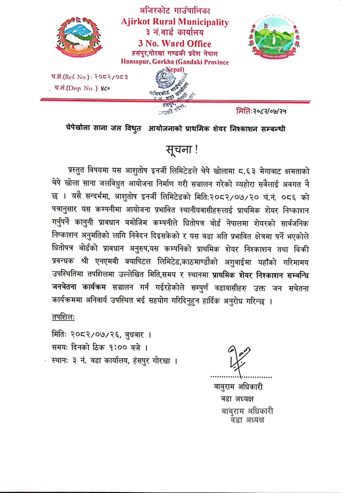 कम्पनीले धितोपत्र बोर्ड नेपालमा सार्वजनिक निष्कासनका लागि अनुमति निवेदन दिइसकेको र त्यसअनुसार जानकारी तथा सचेतना कार्यक्रम आयोजना गर्न लागिएको वडा कार्यालयले जनाएको छ।