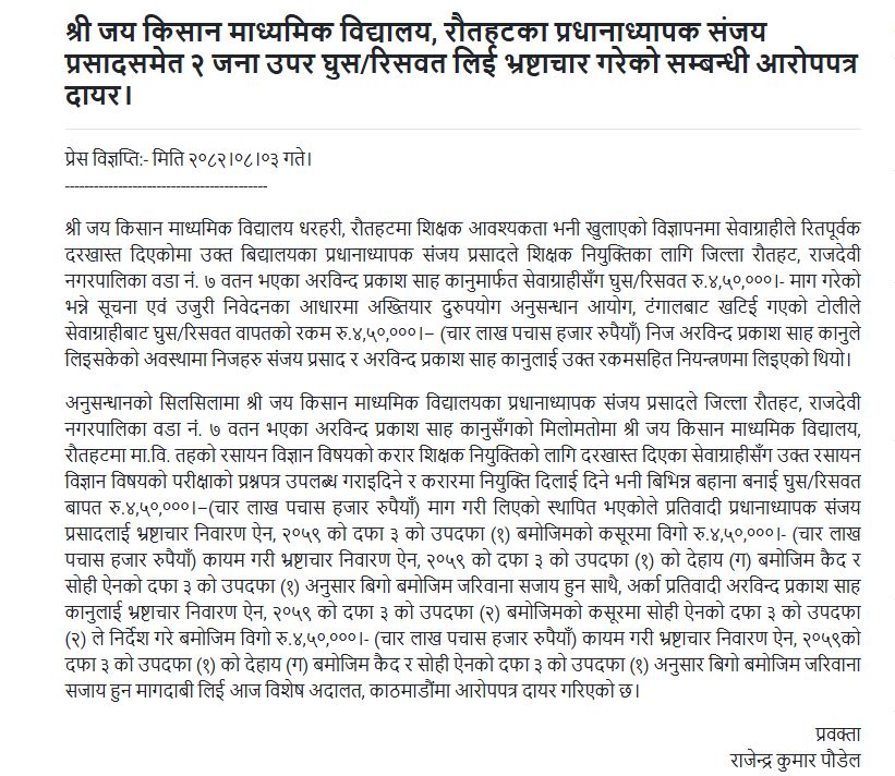 काठमाडौँ- अख्तियार दुरुपयोग अनुसन्धान आयोगले रौतहटको जय किसान माध्यमिक विद्यालयका प्रधानाध्यापक संजय प्रसाद र अरविन्द प्रकाश साह कानुसहित दुईजनामाथि घुस लिएको आरोपमा विशेष अदालत, काठमाडौँमा आरोपपत्र दायर गरेको छ। आयोगले आज विज्ञप्ति जारी गर्दै दुवै व्यक्तिलाई पक्राउपछि आवश्यक कानुनी प्रक्रिया अघि बढाइएको जानकारी दिएको हो।