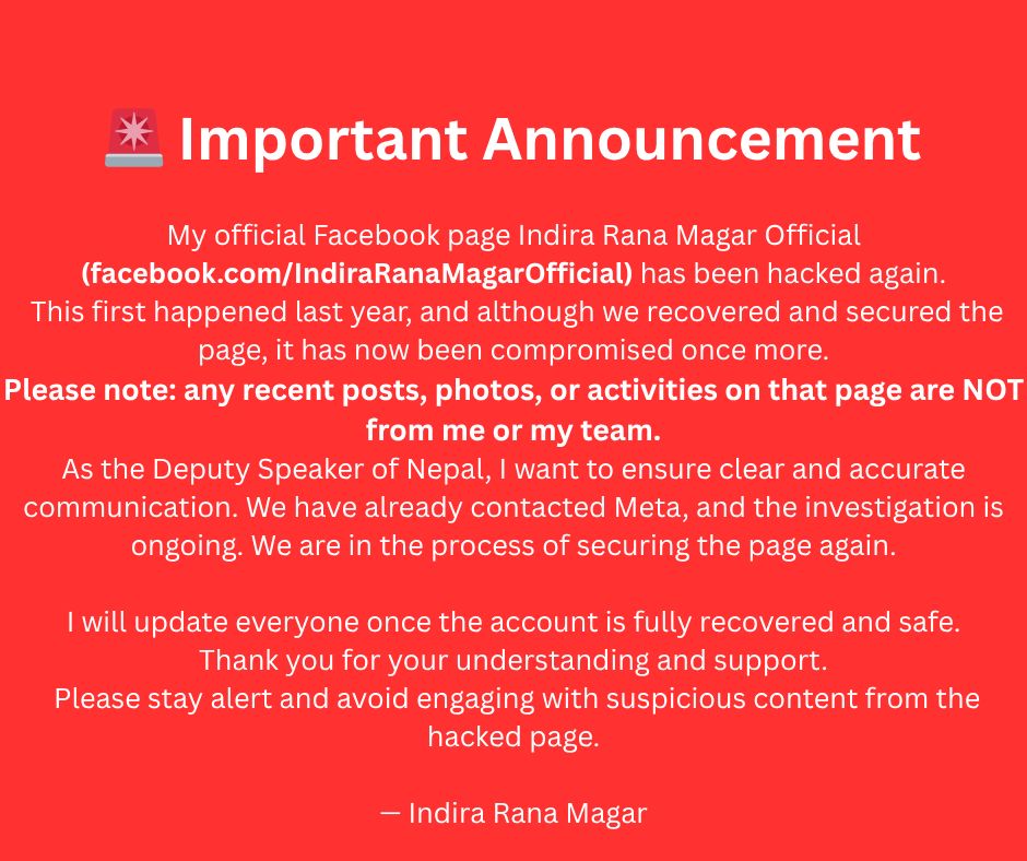 काठमाडौँ- उपसभामुख इन्दिरा रानामगरको फेसबुक पेज पुन: ह्याक भएको छ। उनको इन्दिरा राना मगर अफिसियल भन्ने पेज ह्याक भएको हो।