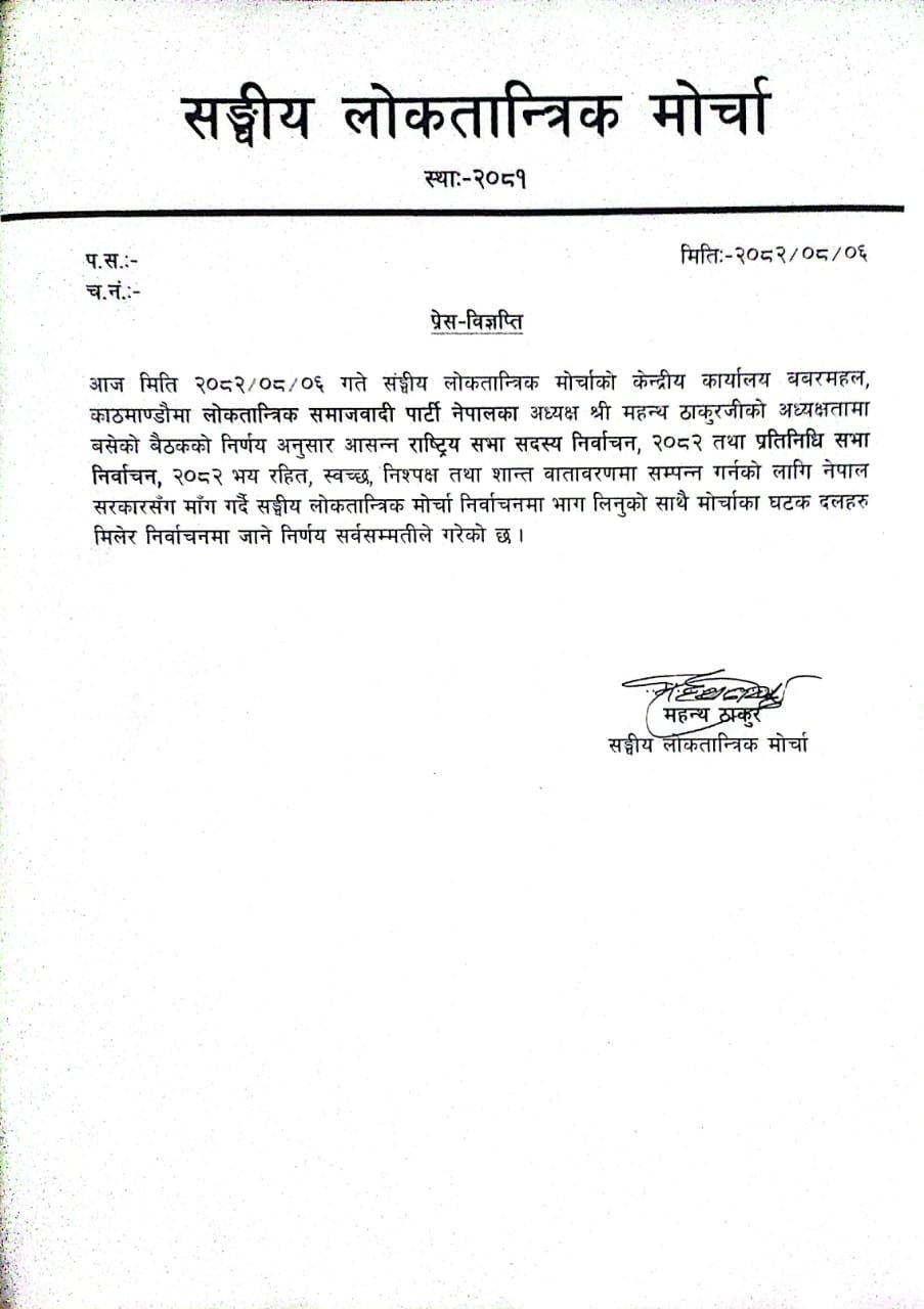 मोर्चाले निर्वाचन सम्पन्न गर्न सरकारसँग भयरहीत, स्वच्छ, निश्पक्ष तथा शान्त वातावरण बनाउन माग समेत गरेको छ।