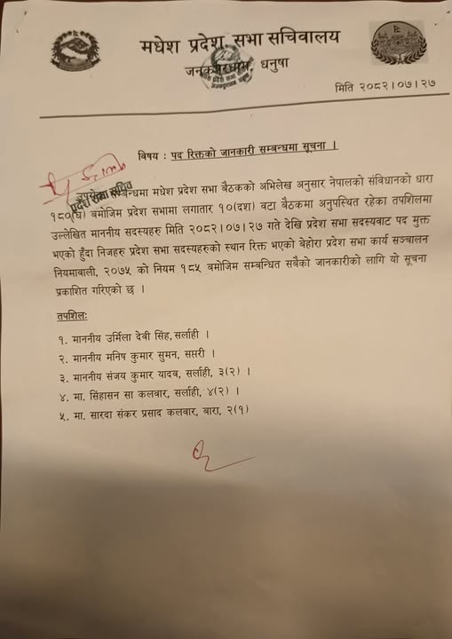 ‘…मधेश प्रदेशसभा बैठकको अभिलेखअनुसार नेपालको संविधानको धारा १८० (घ) बमोजिम प्रदेशसभामा लगातर १० (दश) वटा बैठकमा अनुपस्थित रहेका पसिलमा उल्लेखित माननीय सदस्यहरू मिति २०८२/०७/२७ देखि प्रदेशसभा सदस्यबाट मुक्त भएको हुँदा निजहरू प्रदेशसभा सदस्यहरूको स्थान रिक्त भएको ब्यहोरो प्रदेशसभा कार्य सञ्चालन नियमावली, २०७५ को नियम १८५ बमोजिम सम्बन्धी सबैको जानकारीको लागि यो सूचना प्रकाशित गरिएको छ,’ सूचनामा उल्लेख छ।