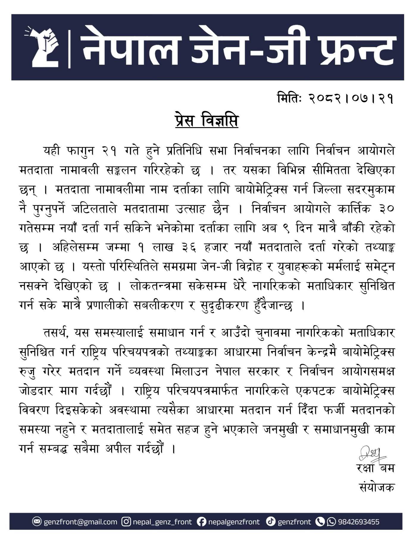 काठमाडौँ- नेपाल ‘जेनजी फ्रन्ट’ले राष्ट्रिय परिचयपत्रको तथ्यांकका आधारमा निर्वाचनमा केन्द्रमै ‘बायोमेट्रिक्स’ रुजु गरेर मतदान गर्ने व्यवस्था मिलाउन माग गरेको छ।